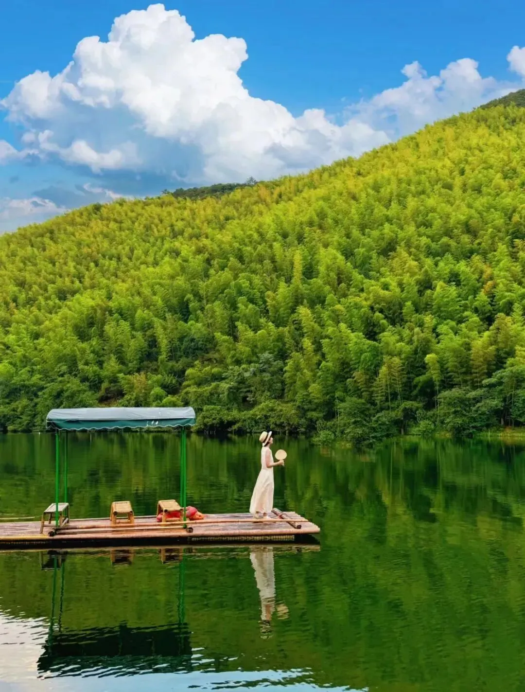 下午还可以乘竹筏,泛舟湖上,看涟漪荡碎满山青翠,也可以到熊猫馆,去看萌萌的熊猫啃竹子。