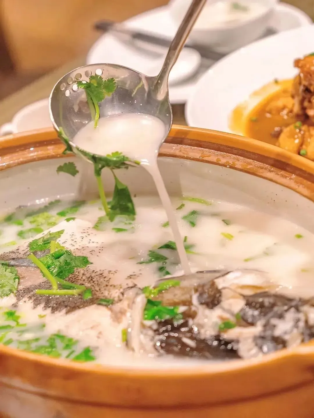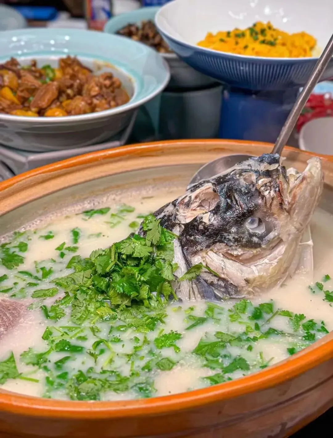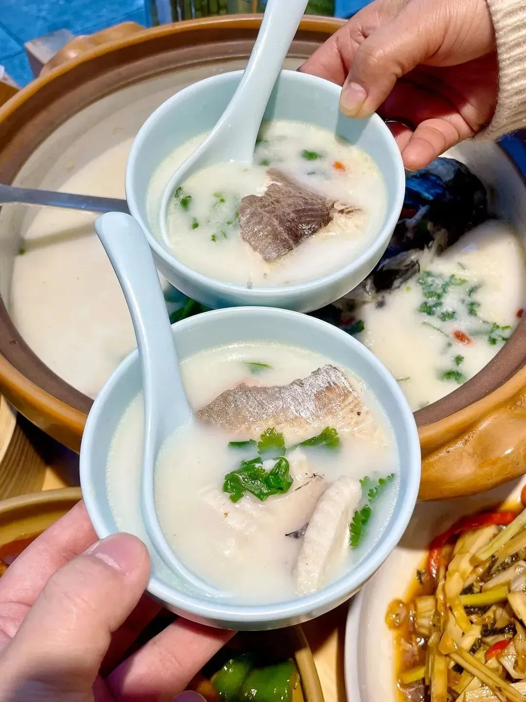 出锅时,汤色乳白似琼浆,鱼肉细嫩如豆腐,鱼头也没有丝毫腥味,入口即化,先喝汤,再拆肉,最后鱼汤泡锅巴,真的“太醉人”了。