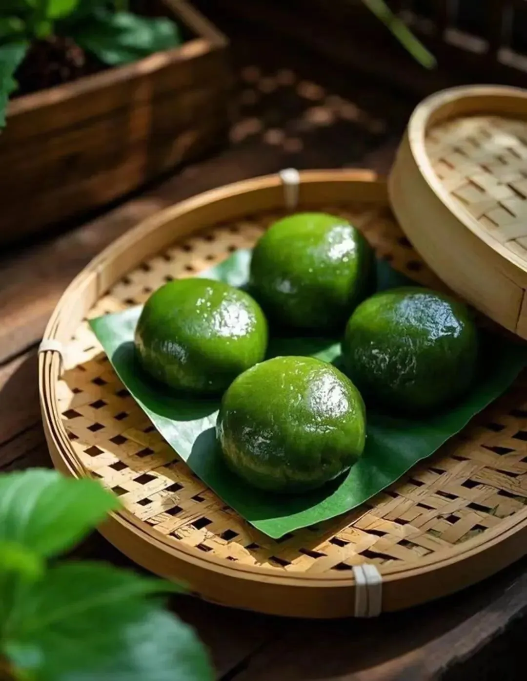 清明时节的艾草青团也值得一品,甜口的以豆沙为馅,咸口的加了咸菜笋丁,一口下去,糯叽叽的,回味时还带着天然的草本清香,太绝了。