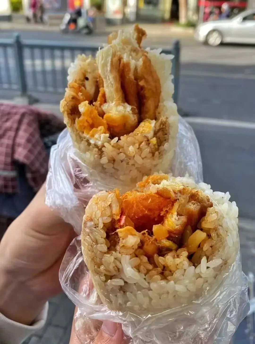 粢饭团是用蒸熟的糯米摊平,压成厚饼状,然后将肉松、油条碎、榨菜丁等小料卷入糯米中,捏紧成圆柱形或椭圆形,入口软糯,油条酥脆。