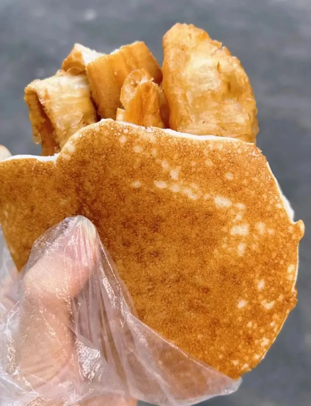 而米饭饼包油条是将发酵米浆摊成圆形薄饼,然后包裹整根油条,对折成半月形,不会加太多的小料,但米香中有淡淡的酒酿香,油条偏柔韧,有嚼劲。