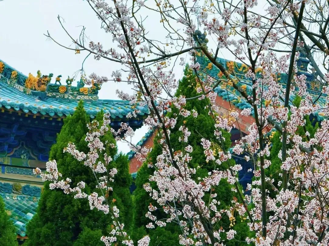 春雨如丝,漫过千年飞檐;繁花似锦,晕染古建红墙。