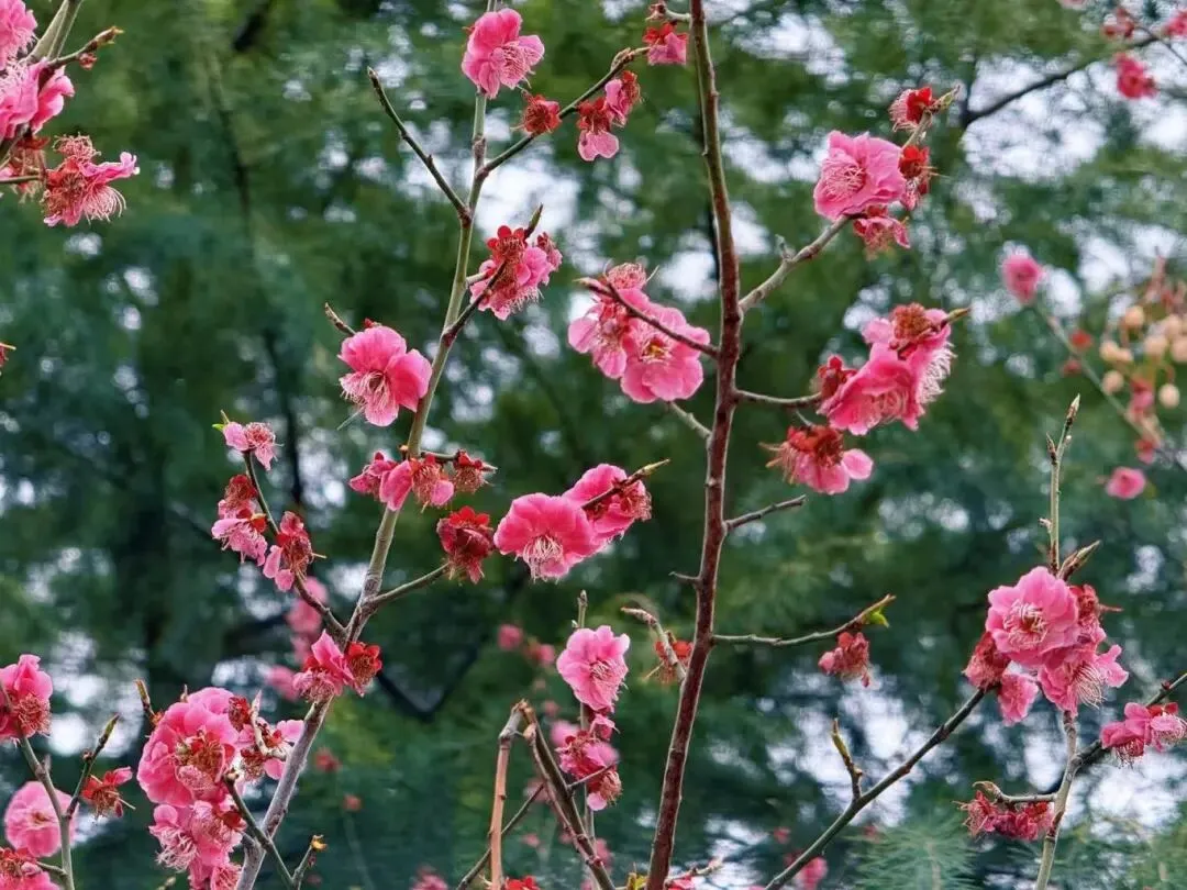 • 红梅:红梅率先报春,嫣红花瓣缀满枝头,细雨中更显娇艳,暗香浮动,是春日里最动人的一抹亮色。