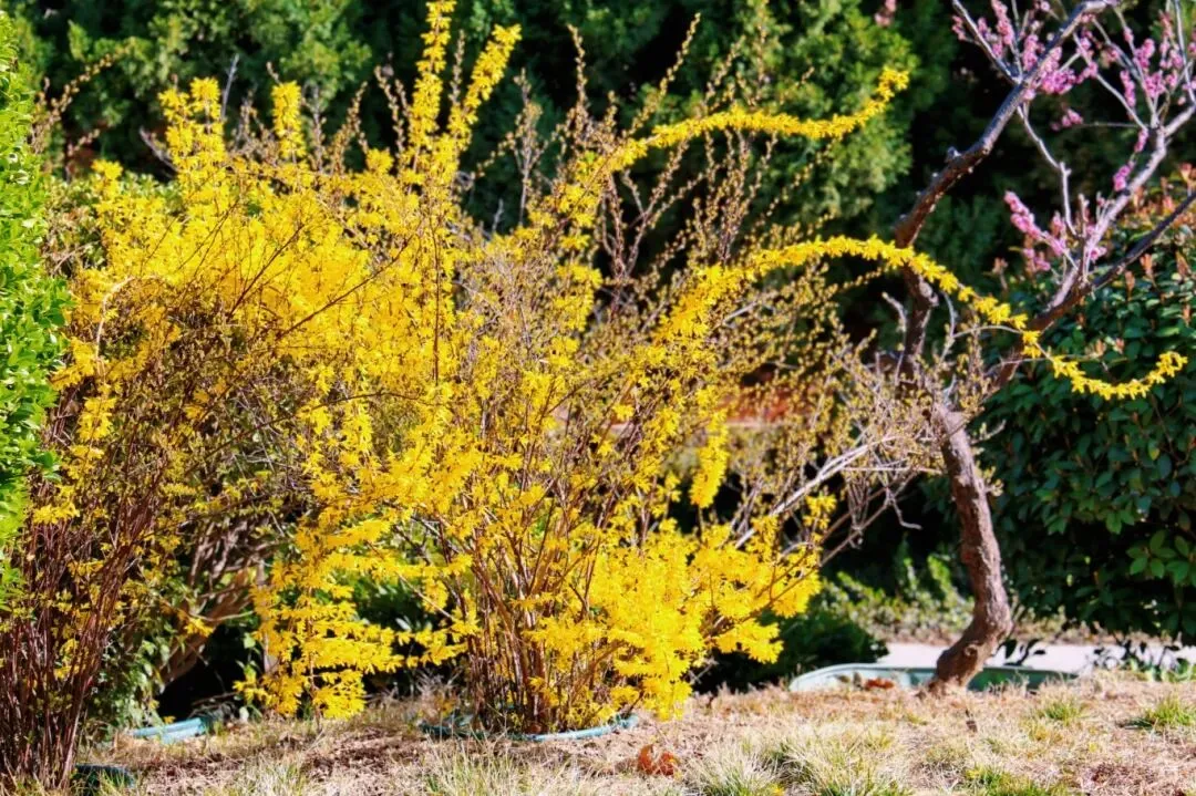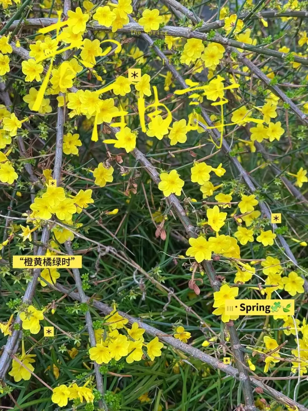 • 连翘:与迎春相映成趣,满枝金黄,花朵小巧精致,花瓣向上翘立,与红墙黛瓦相映,尽显春日生机。