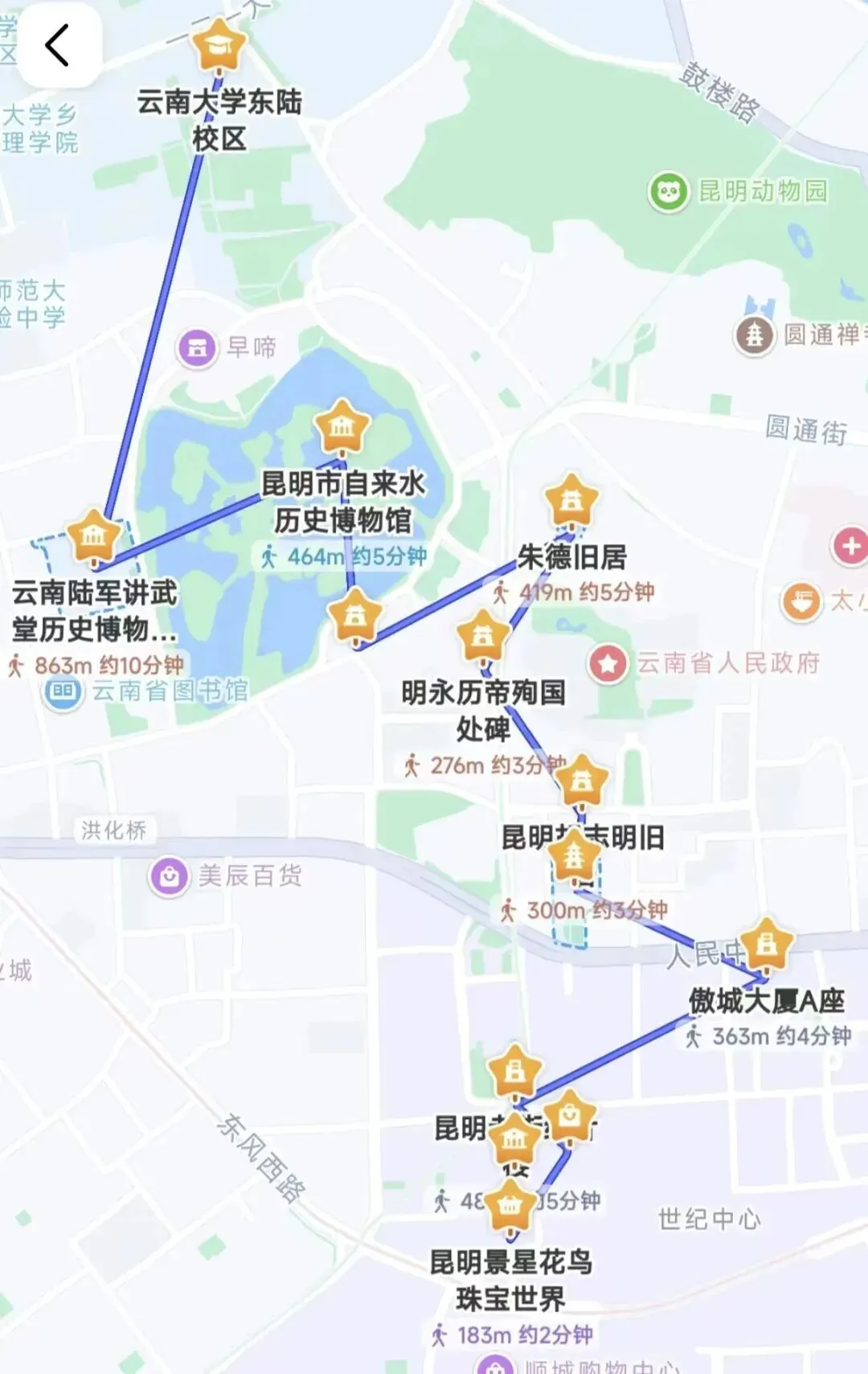 飞往昆明的机票往往最便宜,因此昆明常作为旅游第一站。游玩时间可根据行程灵活安排。 如果只有半天时间: 推荐市区Citywalk,约3小时即可打卡精华景点。路线包括翠湖公园、云南大学等,感受春城的悠闲氛围。