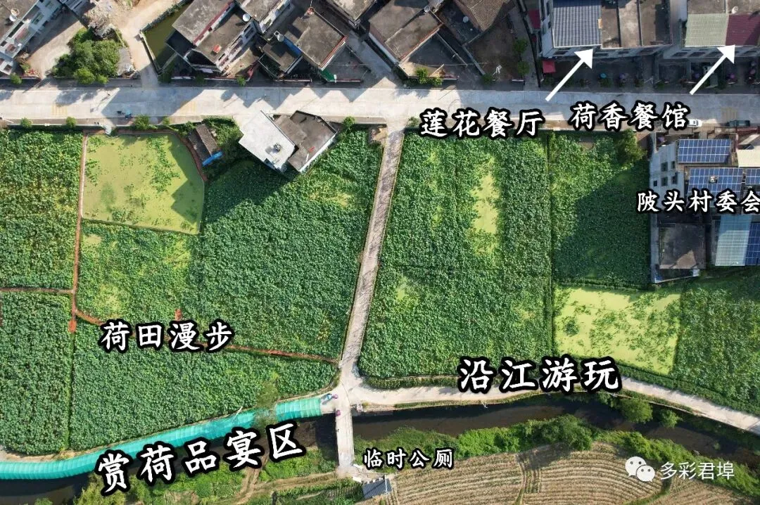 ——陂头村委会周边安排有莲花餐厅、荷香餐馆,游客可以在观看主会场表演后沿江游玩,在荷田中漫步、在绿意中赏荷品宴购小吃。