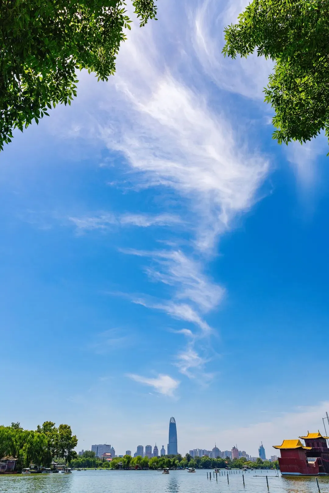 ↑ 从雨荷厅向西南拍摄,绿地中心上空的卷云象是从宝瓶中散发出来的迷烟,谁能给这张照片起个好名字?2023.8