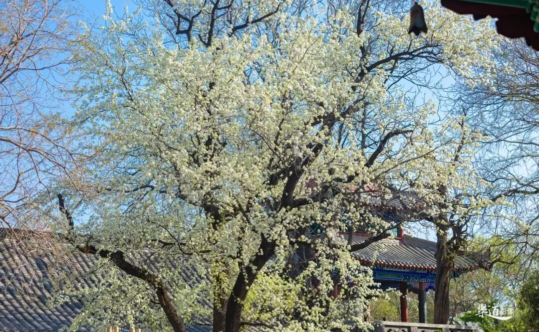 ↑ 雨荷厅东北方向有一棵古老的杜梨,后面是明昌钟楼,内有金代古钟,2025.3