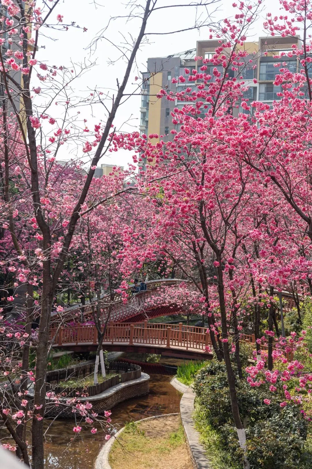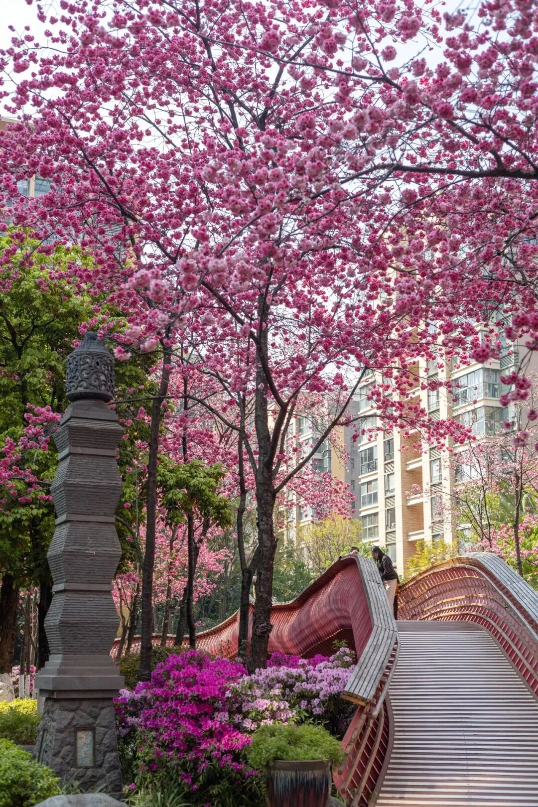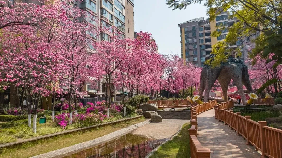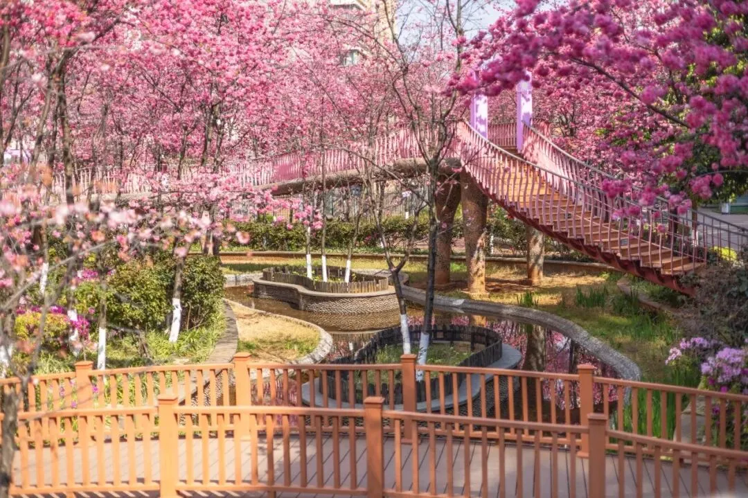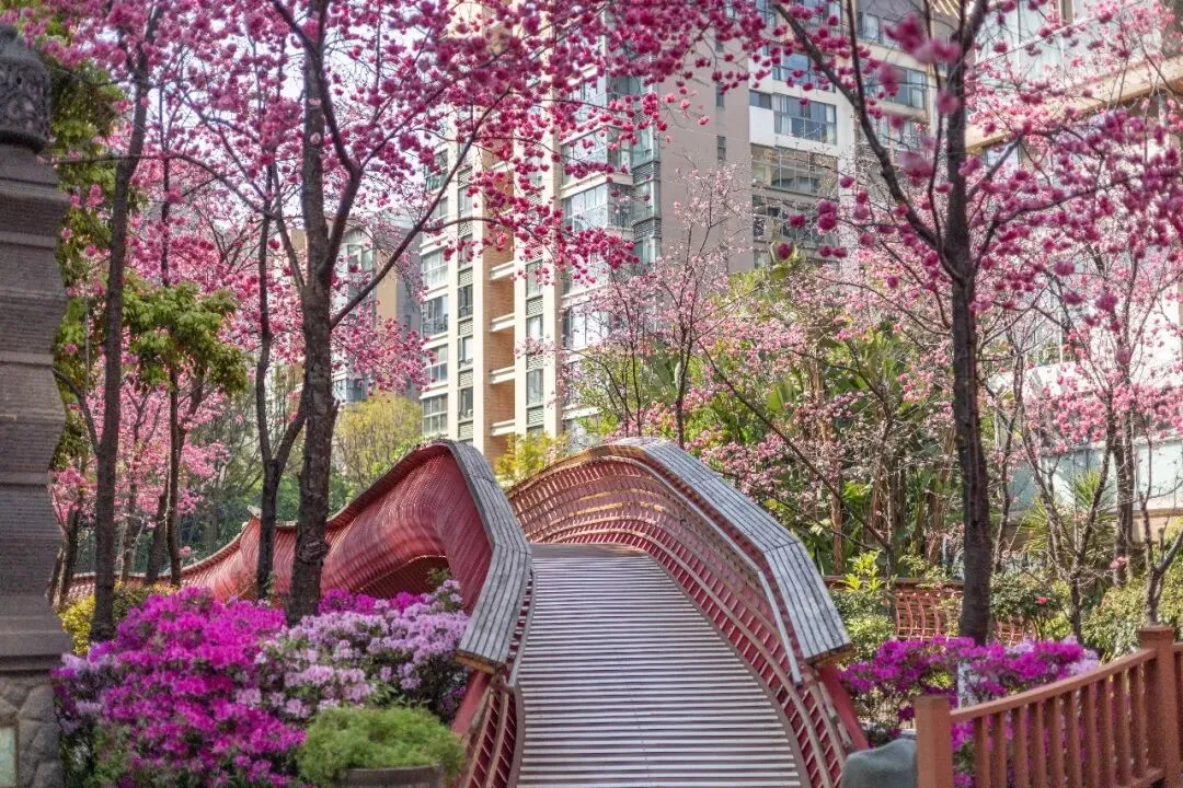小桥、雕塑、落英缠在一起,樱花与竞相绽放的杜鹃花相映成趣,姹紫嫣红间藏着中式园林的雅致。原来昆明的春天,从不是单一的盛放。它从不会刻意张扬,而是悄悄藏在城市的缝隙里,藏在寻常小区的角落中,藏在每一个“推窗即春”的惊喜里。