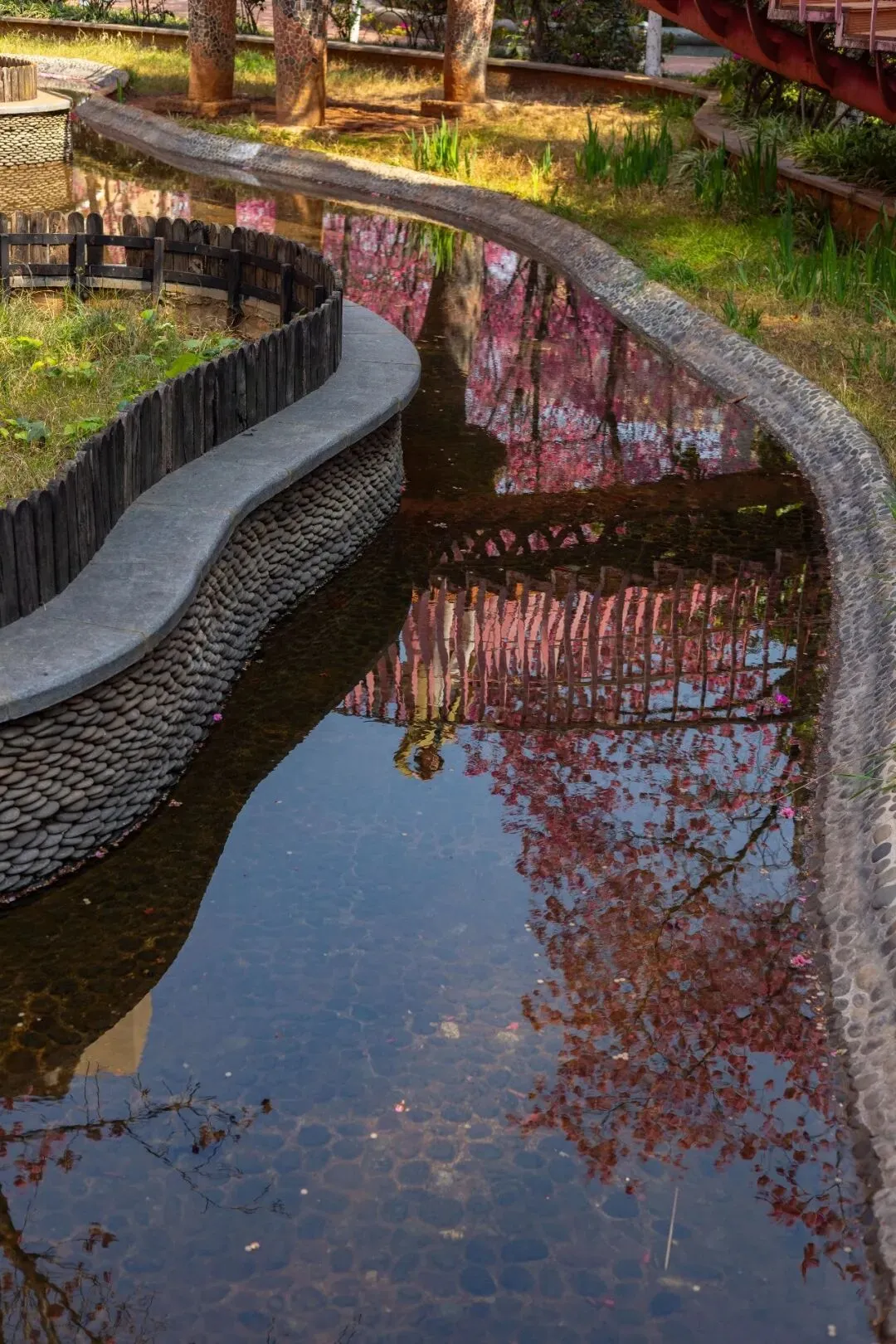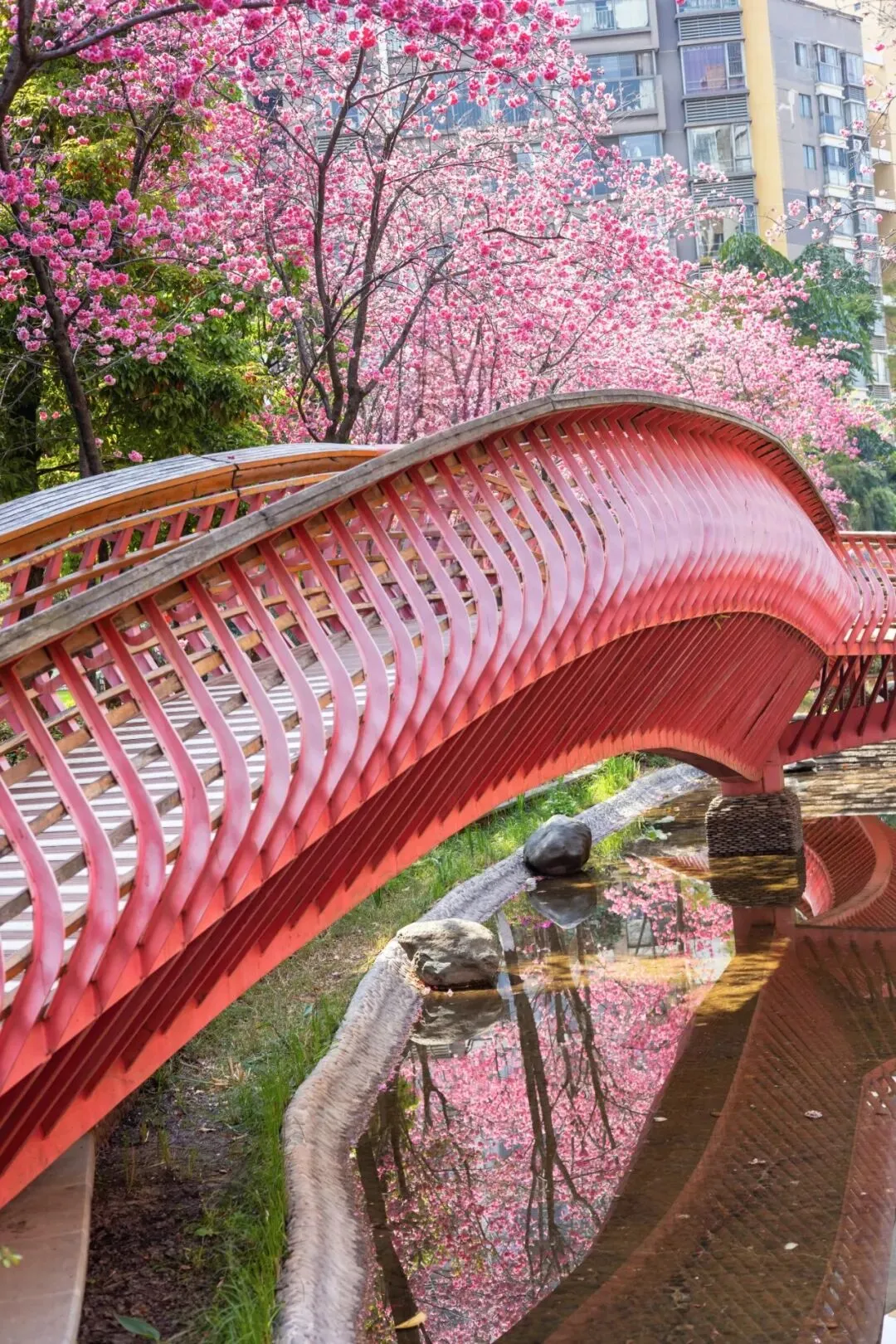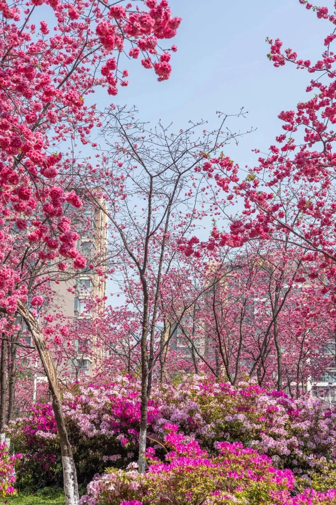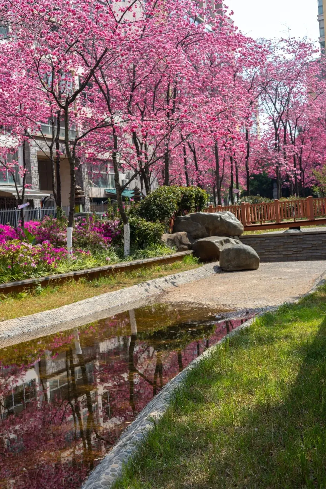 小桥、雕塑、落英缠在一起,樱花与竞相绽放的杜鹃花相映成趣,姹紫嫣红间藏着中式园林的雅致。原来昆明的春天,从不是单一的盛放。它从不会刻意张扬,而是悄悄藏在城市的缝隙里,藏在寻常小区的角落中,藏在每一个“推窗即春”的惊喜里。