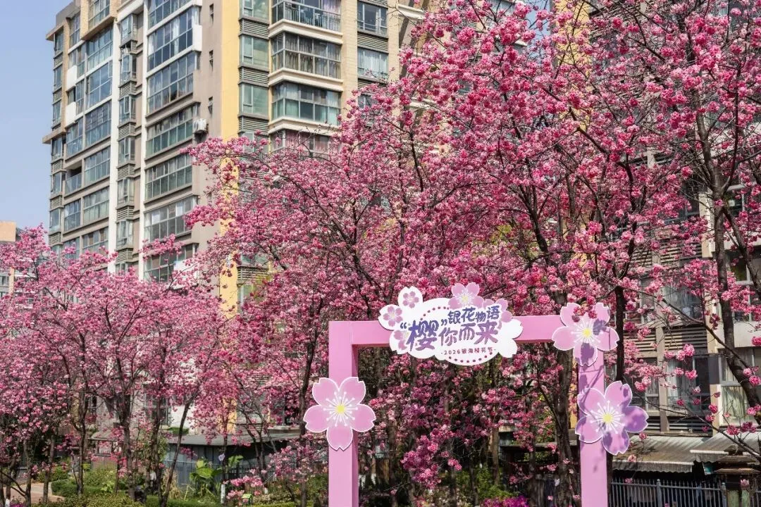 3月的银海·樱花语·阳光里,正被一场粉色盛宴包裹。恰逢2026银海樱花节,以“银花物语・‘樱’你而来”为主题,百余株樱花次第盛放,粉白相间,如云似霞,把整个小区都晕染成了温柔的色调。住在这里的人,大抵是被春天偏爱的。推窗是即是春,粉樱密密匝匝缠满桥栏,远处的居民楼褪去了平日里的朴素,成了春天最温柔的背景板,一步一景,步步皆诗。