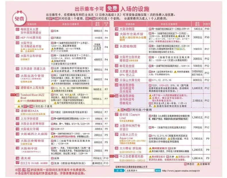 利用它可以在大阪免费参观40多处景点,基本覆盖了大阪府区域内的大部分景点,省去了大家排队买票的烦恼,而且多参观几个景点,就足够值回开卡价格,可以说是超级划算了!