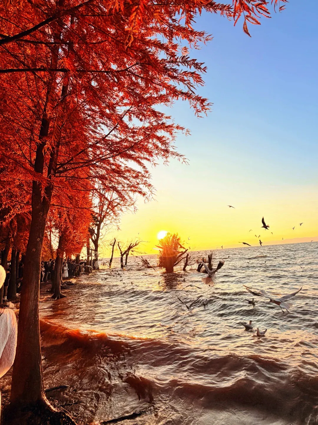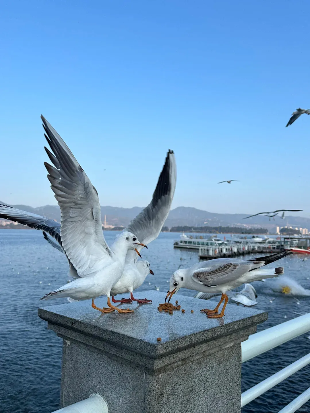 冬季观鸥时可自带鸥粮投喂;傍晚的翠湖日落十分浪漫。