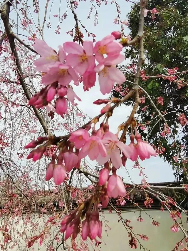 紧接着,空海纪念碑附近的八重红枝垂樱也开了,柔枝低垂,粉花娇艳。