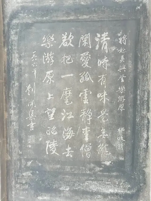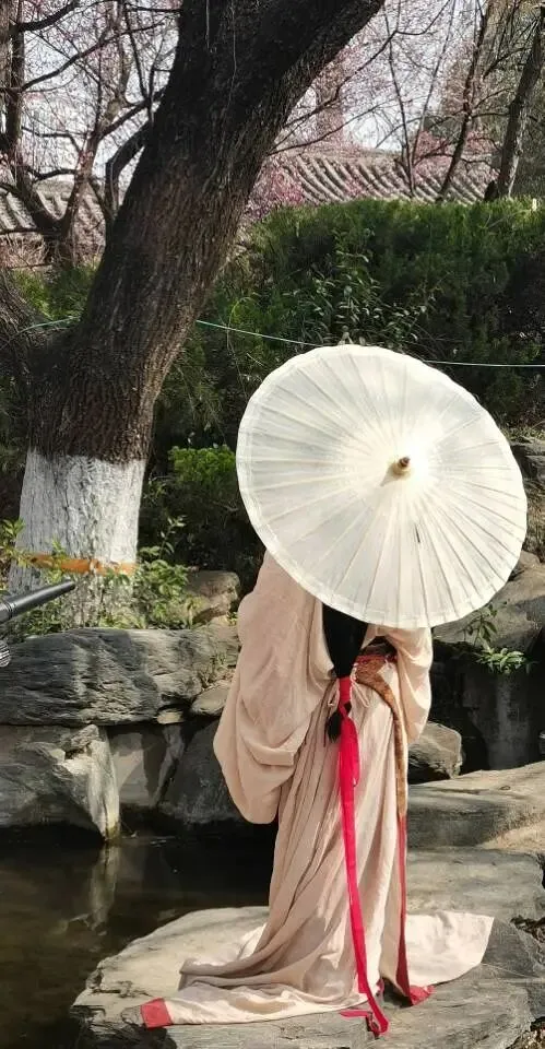 这位身着浅杏色汉服的女子,长长的黑发用红绸带系着,手持一把素白油纸伞,站在水池边的青石板上,美成一幅画。 樱花园里还可以欣赏书法。