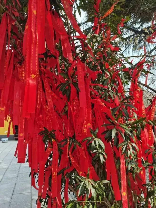 这是刻在园内墙壁上的一首古诗:清时有味是无能,闲爱孤云静爱僧。欲把一麾江海去,乐游原上望昭陵。 “闲爱孤云静爱僧”,孤云象征自由与漂泊,僧象征宁静与超脱,意境令人神往。 书法出自著名雕塑家刘开渠之手,雄健洒脱,古意盎然。 樱花园西边的青龙寺庄严肃穆。院子里香烟缭绕,古树上挂满了祈福的红绸带,有人跪在垫子上拜菩萨。登上台阶,走进大殿,莲花灯里烛光摇曳,如来佛像两侧金花灿烂。这里人很少,个个敛声屏气,唯恐惊扰神明。