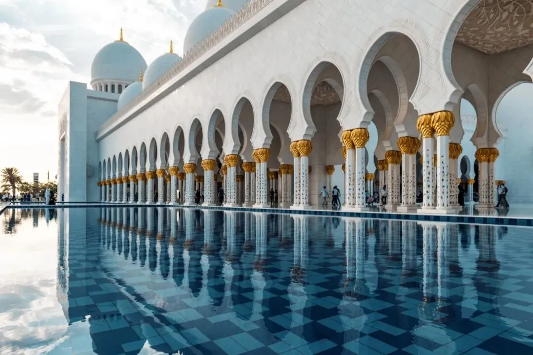 谢赫扎耶德大清真寺如同沙漠中的一座白色奇迹,这座世界上第三大的清真寺,也是唯一一个对非穆斯林也开放参观的清真寺。白色的外墙源自马其顿普利来普罕见的斯拉夫白“Sivec”,并镶嵌各色宝石装饰,有紫晶 、玛瑙、红东陵等。据说,将贝壳和宝石镶嵌进大理石的工艺还是出自中国工人之手~