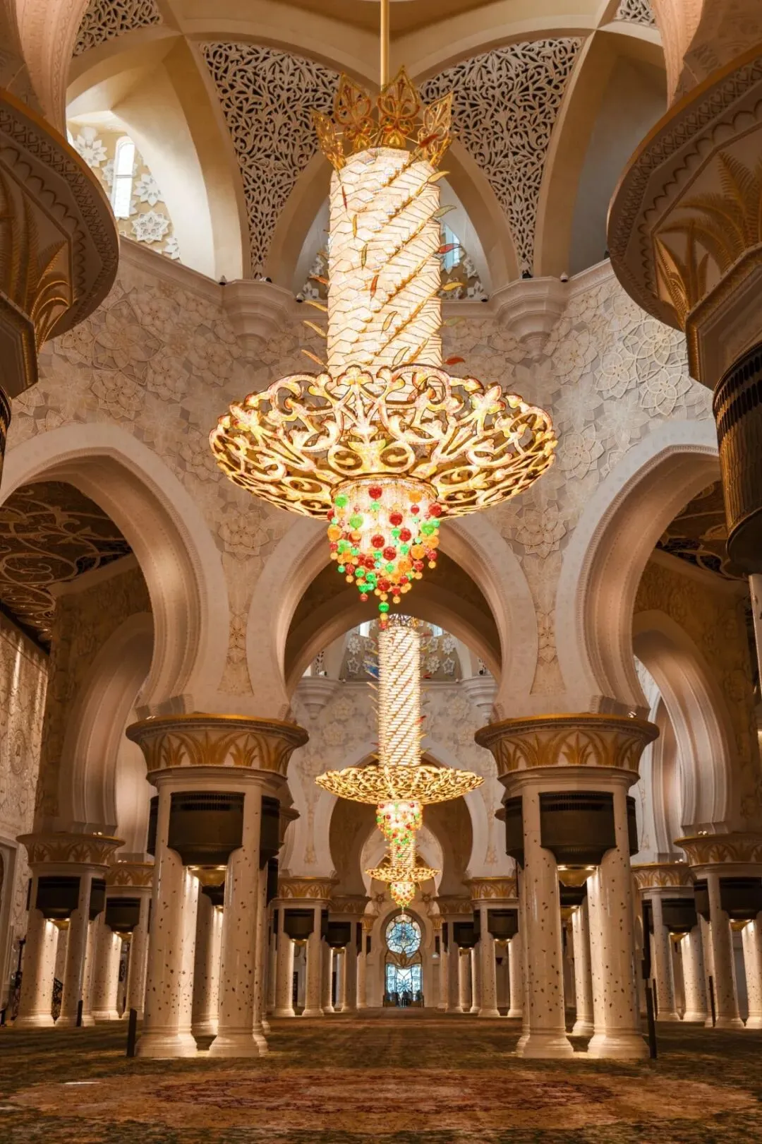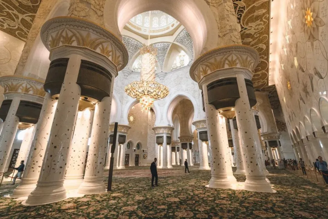 清真寺内部的装饰更是精美绝伦,仅黄金就用了46吨,汉白玉砖墙更是不计其数,还有重达12吨的世界最大的镀金水晶吊灯,表面全部镀金并缀满施华洛世奇水晶,据说建设总花费约55亿美元!不仅如此,还有世界上最大的手工编织地毯——由1200名女工手工编织而成,面积有5627平方米,繁花似锦,流光溢彩。