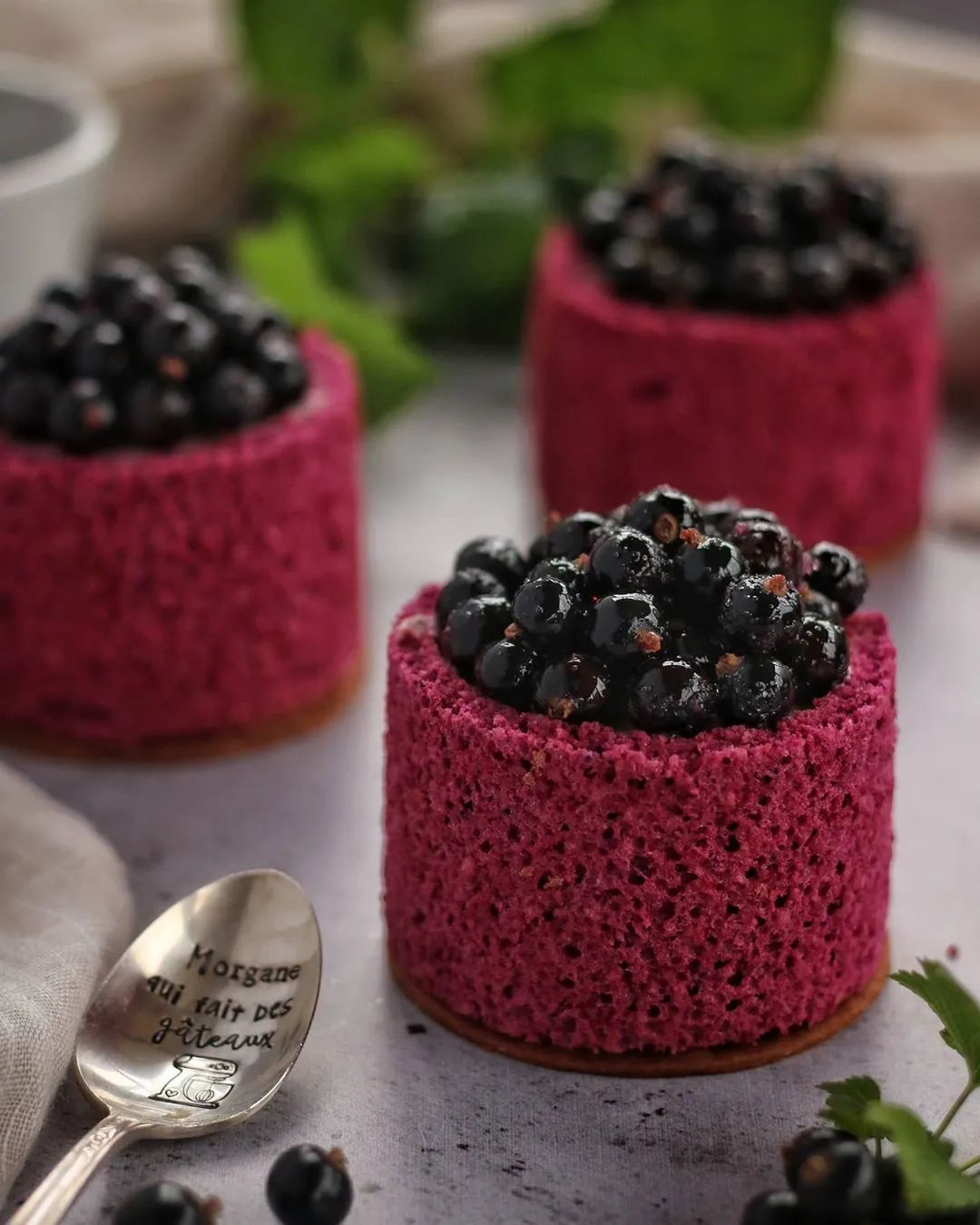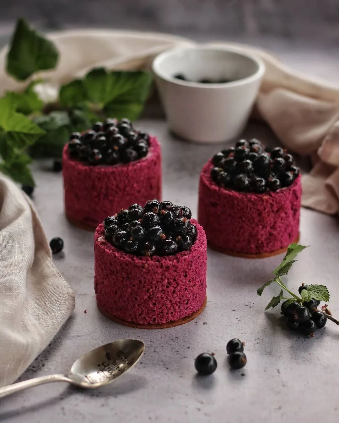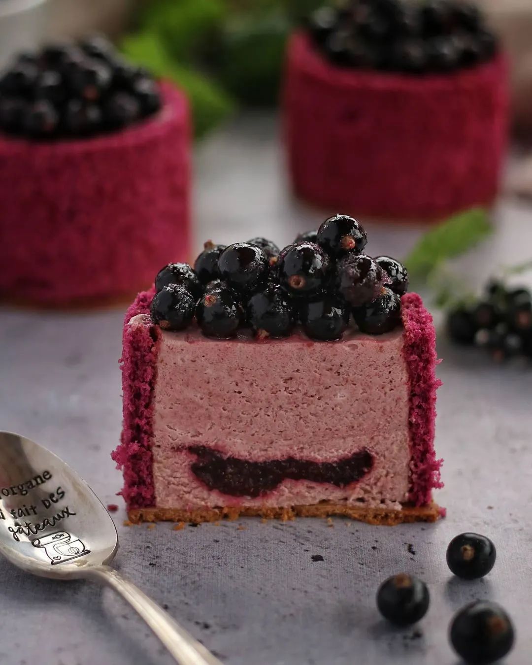 4、脱模,放在烤熟并已冷却的甜面团饼干上,顶部堆满“糖渍黑醋栗”,最后磨撒少量Timut胡椒,点缀粉色黑醋栗花瓣(或其他花/叶)。