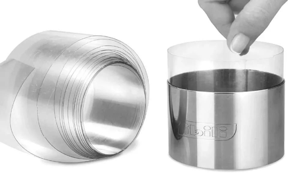 2、将裁切为φ6x3.5cm的PVC透明围边软片放入圆筒形模具内,并将蛋糕条放入紧贴内壁。(下图示)
