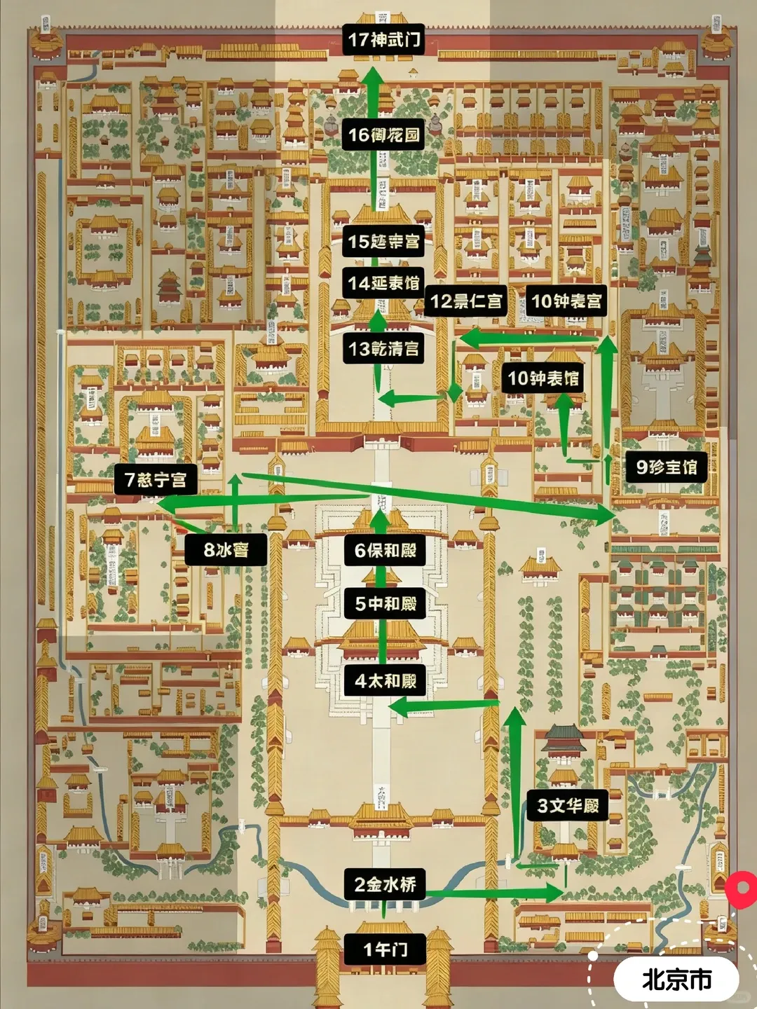 路线:午门 → 太和殿 → 中和殿 → 保和殿 → 乾清宫 → 交泰殿 → 坤宁宫 → 御花园(重点!)→ 神武门