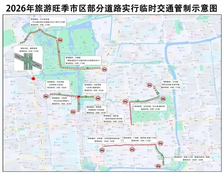 为进一步做好旅游旺季期间市区主要景区周边道路交通管理,确保道路交通安全、畅通、有序,根据《中华人民共和国道路交通安全法》及《中华人民共和国道路交通安全法实施条例》的有关规定,自2026年3月14日起至2026年5月5日止,逢双休日和清明、五一假期,视情对以下道路采取临时交通管制措施:
