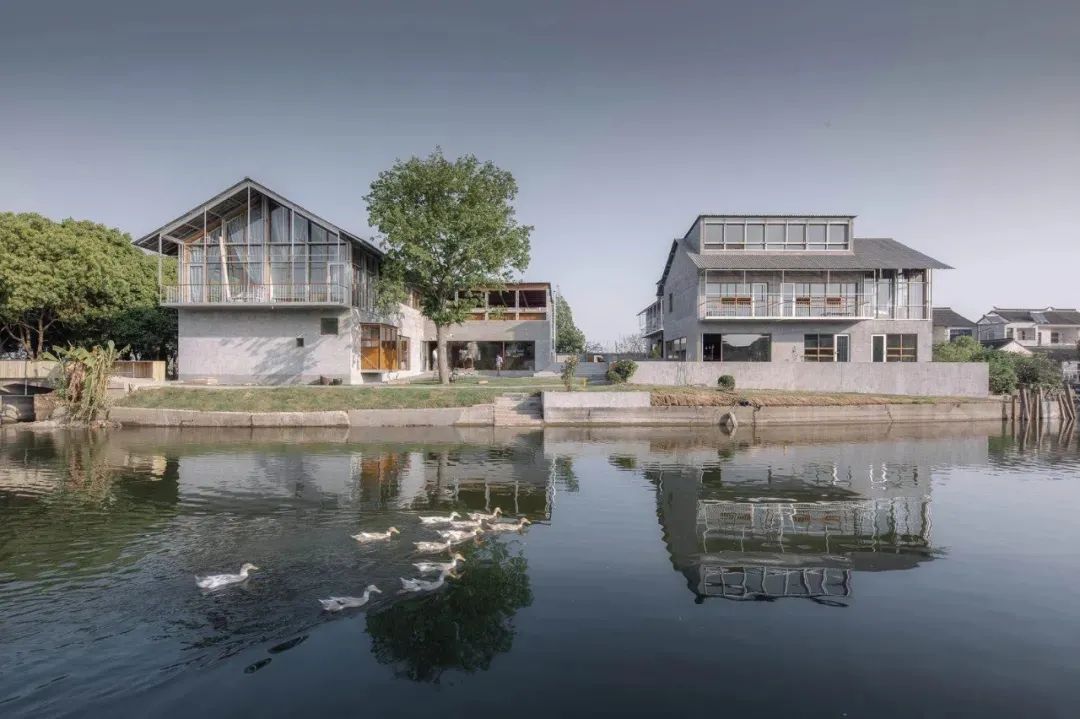 从河对岸望去,建筑被“分割”成上下两半,含蓄地表达出民宿主“一半舍得,一半舍不得”的人生哲学。有趣的是,村口的两位新村民为锦溪当地人,两代人的回归故乡演绎出一段佳话。