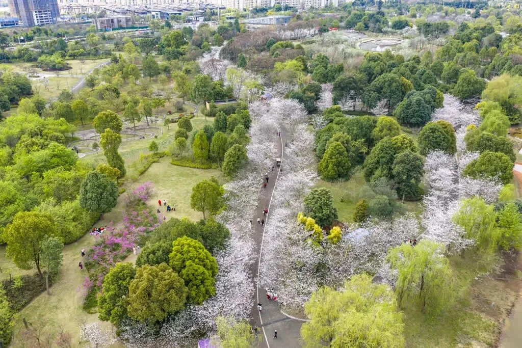 蜿蜒步道两侧樱花树错落有致