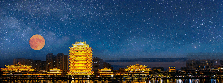 远处塔影与灯火倒映江中
