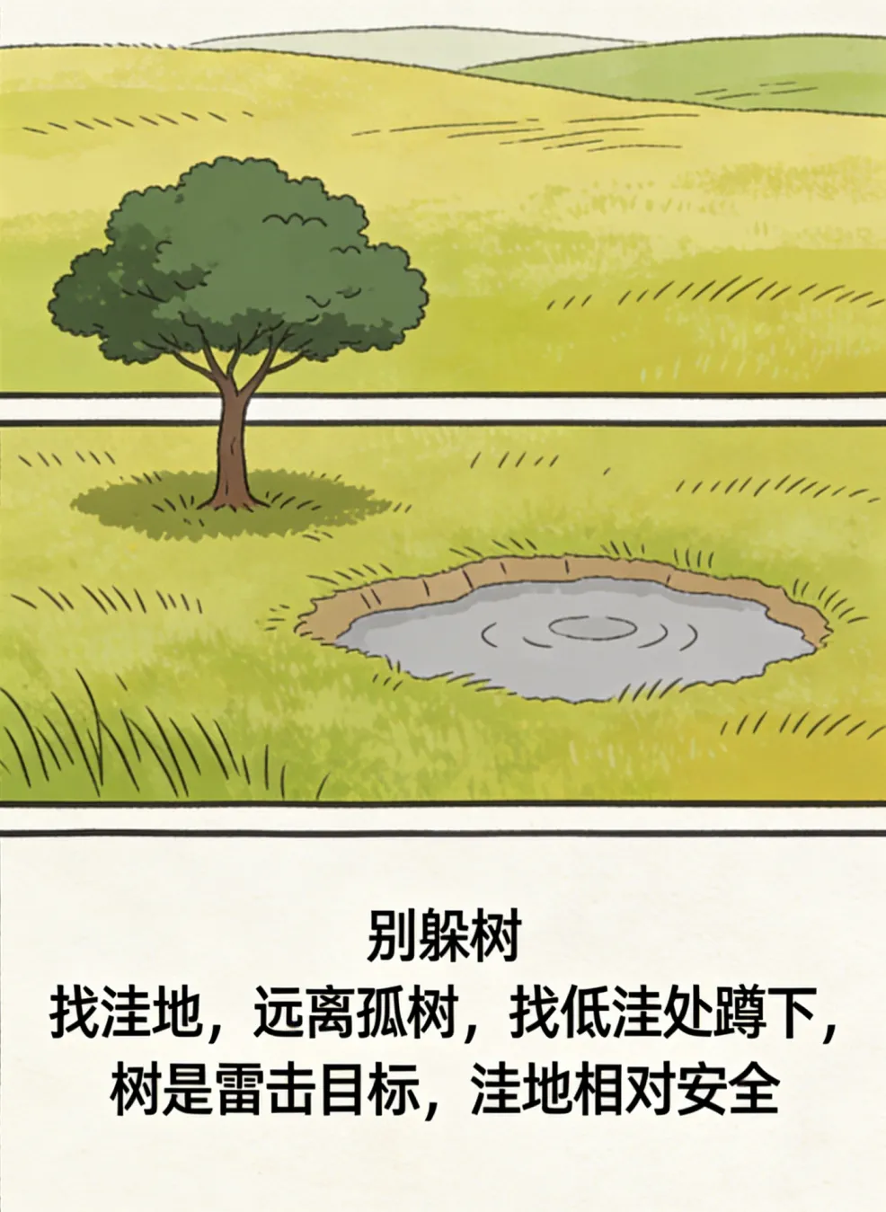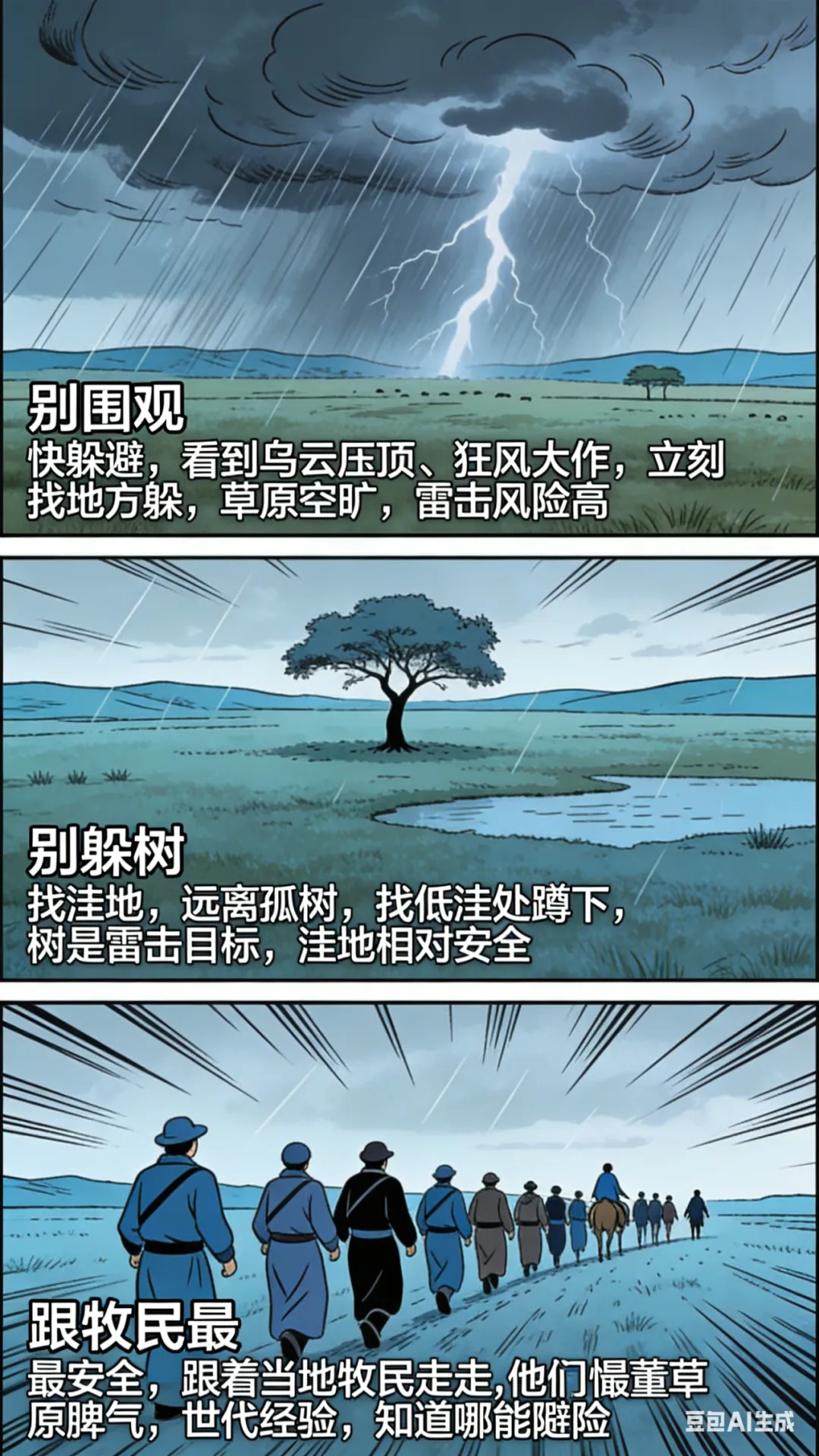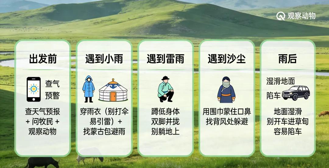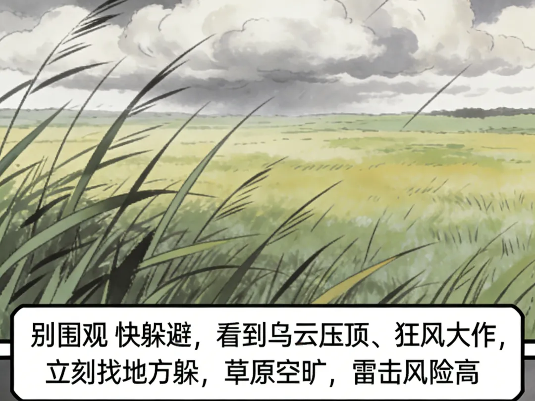 了解了动物预报,花花还要送大家一份草原避险实用指南——万一遇到突发天气,这几招能救命:
