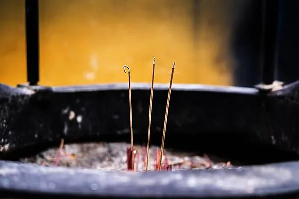 4.点香去专用的点香处点燃香火,不可去香炉内取火,亦不宜用打火机点燃。左手点香,因为佛教认为左手是最干净的。燃香后香头朝上,用右手把火轻轻扇灭,不宜用口吹灭,然后再用右手插在香炉中。