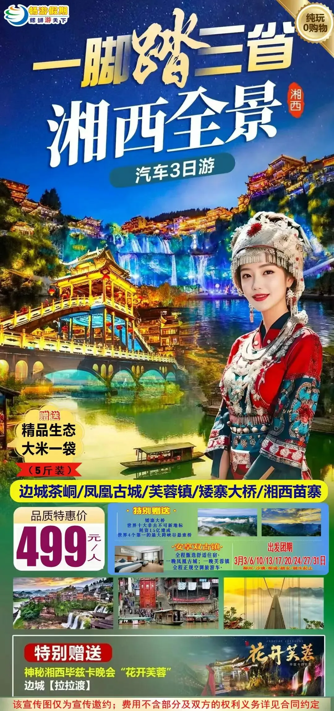 3月20日/27日(两期,已经成团,有位)湖南一脚踏三省·凤凰古城、边城茶峒、芙蓉镇、矮寨大桥精品纯玩汽车3日游499元/人