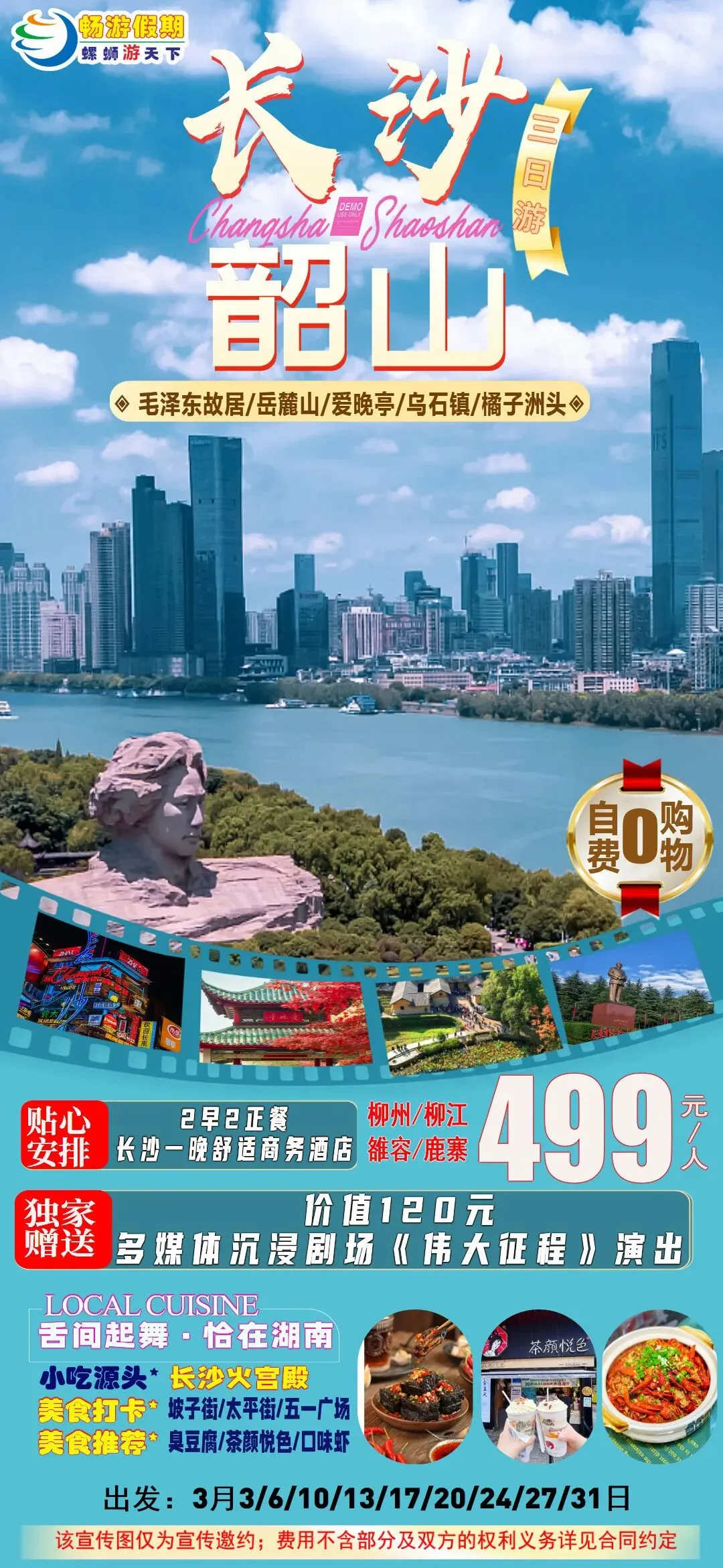 3月20日/27日(两期,已经成团,有位)韶山毛泽东故居、长沙橘子洲头、乌石镇纯玩三日游499元/人