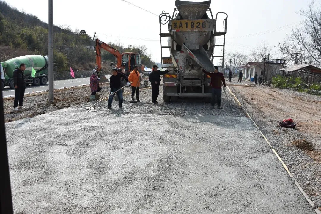春日的固江口水库碧波荡漾,与远处的九连尖构成一幅绝美的山水画卷。在水库东侧路边,一辆混凝土搅拌车正在轰鸣作业,几名工人正手持工具,忙着对路面进行最后的平整和浇筑,这里即将变身为一处崭新的停车场。