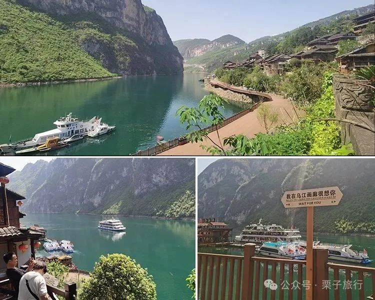 “轻洲漫,乌江长,一叶飘渡过画廊 ”两岸青山相对,山峦映照在江水中影映成一片墨绿,入目皆绿,“乌江”的名字似乎也是名副其实。去看看九黎宫和乌江画廊吧,船行其中,仰天崖壁连绵不断,时常忘记了船行的速度,只有山崖顶部的绿阴和江岸的纤道变幻景致,成为视觉的流线