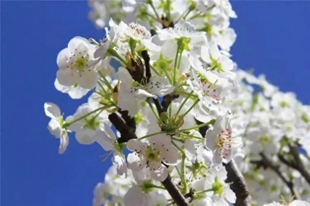 4月正是梨花盛开时节,远远望去,那一簇簇雪白的梨花,如团团云絮,漫卷轻飘。