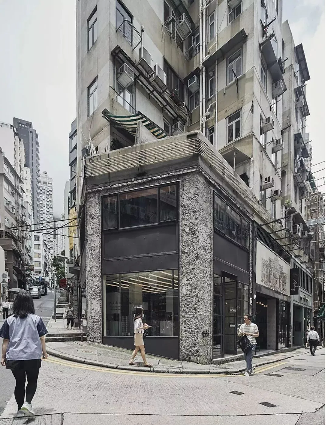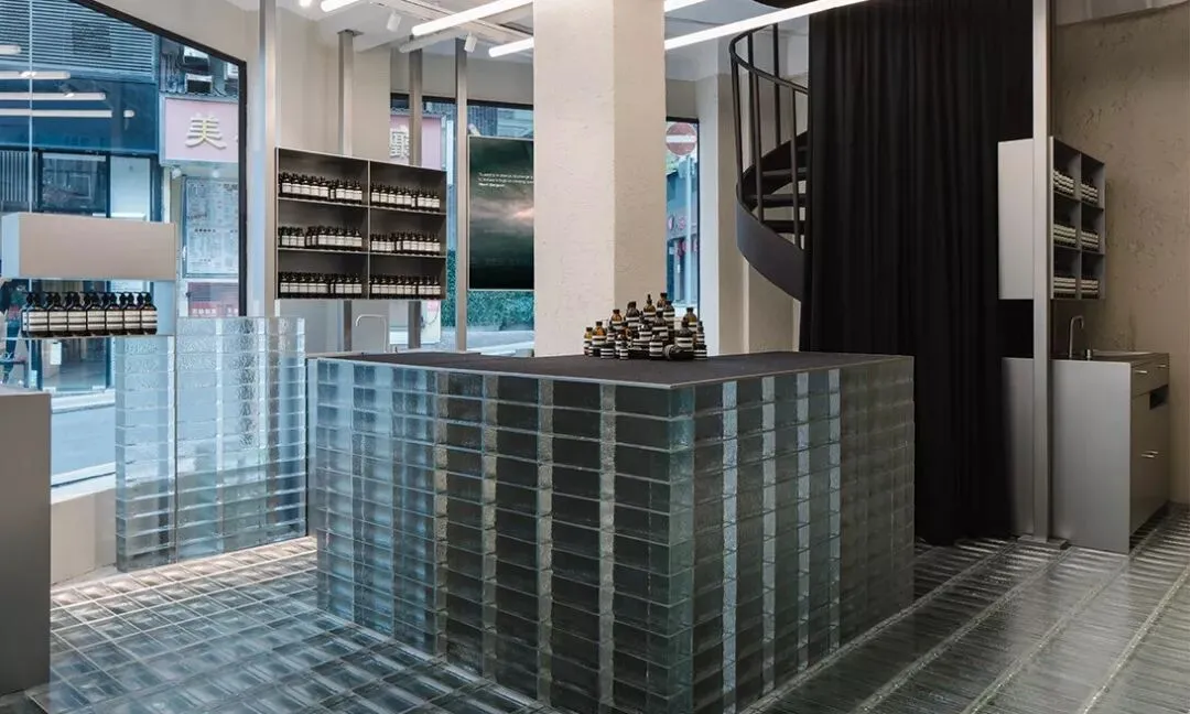 Aesop歌赋街店地处香港的金融心脏中环,它试图成为香港城市特色的缩影,排排玻璃砖构成悬空的网格或梯子,令人联想起鳞次栉比的香港高楼。 歌赋街店所处的位置很有趣,它被交汇的街道切割成楔形,一条上坡道从侧面穿过,最开始,建筑师就决意不与这种奇怪的地形条件对抗,将哥赋街的街道坡度引入店铺——顾客从街面进入店门后,会立刻再登上一级玻璃砖台阶。