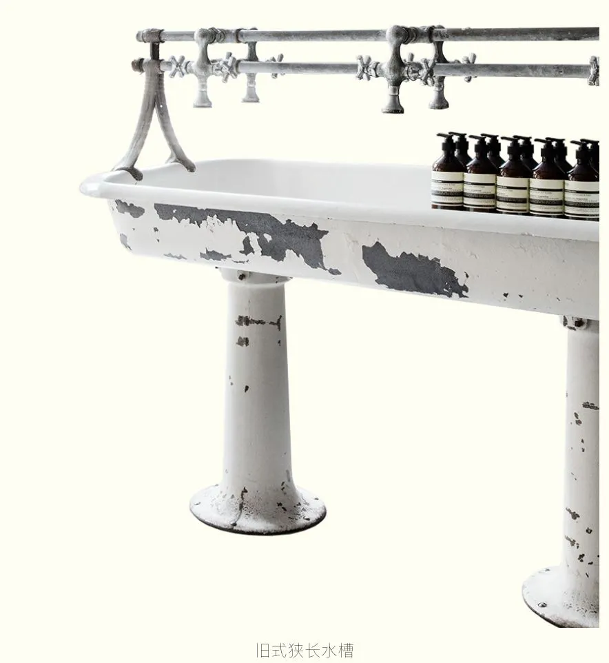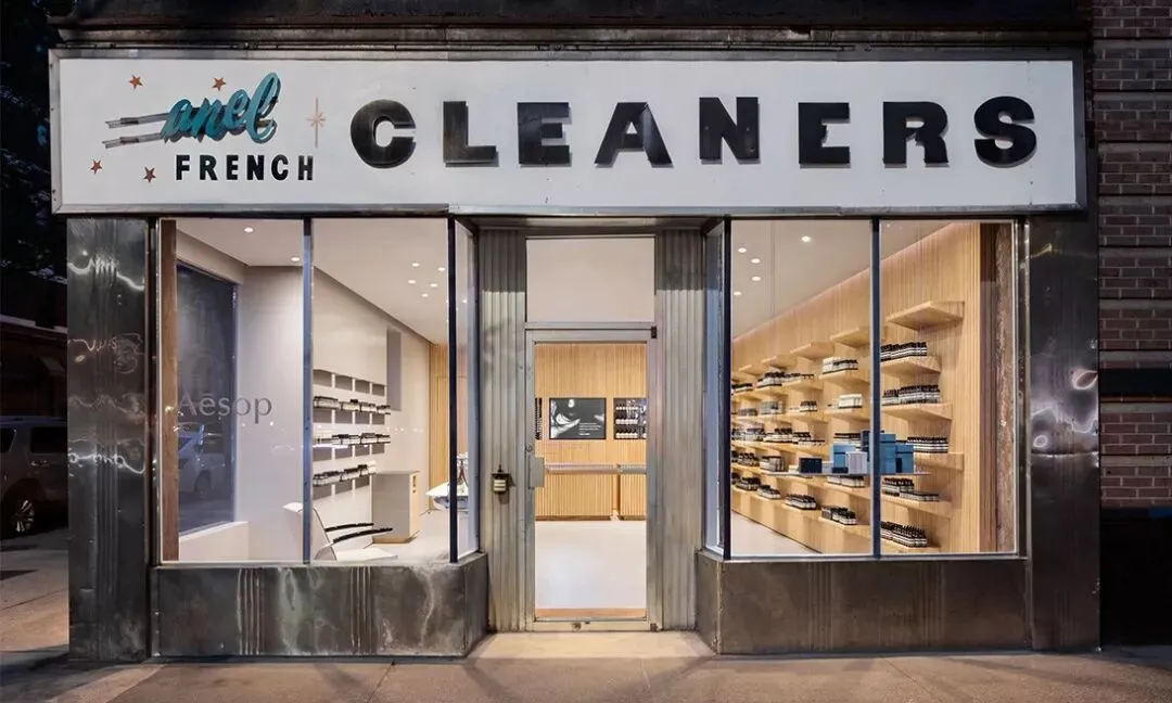 现在许多品牌设计时兴做旧,但Aesop 常常是真的直接拿旧的用。 这里,曾经坐落着由家族经营的阿内尔法国干洗店。Aesop 希望能够将理发店、发廊、洗衣店等受到当地居民信赖的店铺所代表的传统延续下去。设计师保留了压制金属材质的门面以及老招牌, 独立旧式水槽位于空间一侧,其磨损的搪瓷表面见证了岁月的沧桑之美。