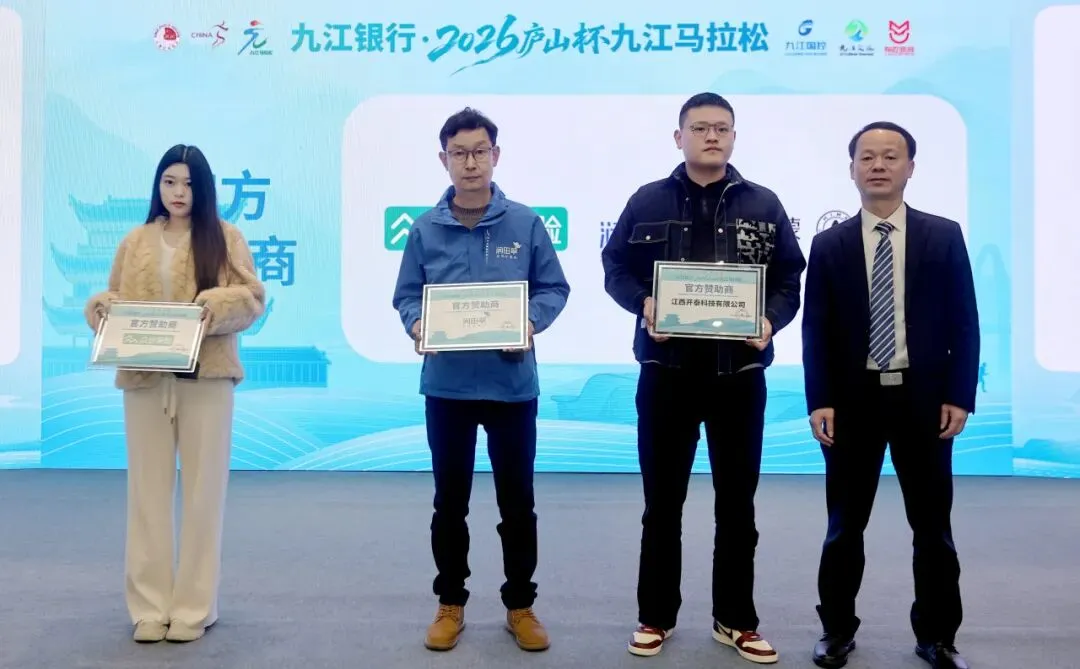 发布会现场举行了赞助商授牌仪式,九江市人民政府副秘书长方忠生为赛事独家冠名商九江银行授牌;九江市国控集团党委委员、副总经理,文旅集团总经理张伟光为赛事官方赞助商众安保险、润田翠、华为经销商授牌;江苏有迈体育发展股份有限公司总经理王成为赛事支持商海之言、汤达人、仙客来、安能晟、浔阳江、英智科技、中国邮政、喵走科技、TCL空调、开元酒店授牌。各合作企业的倾力加盟,为赛事的高品质、高规格举办提供了坚实保障,也让人文马拉松的理念得到更广泛的传播。