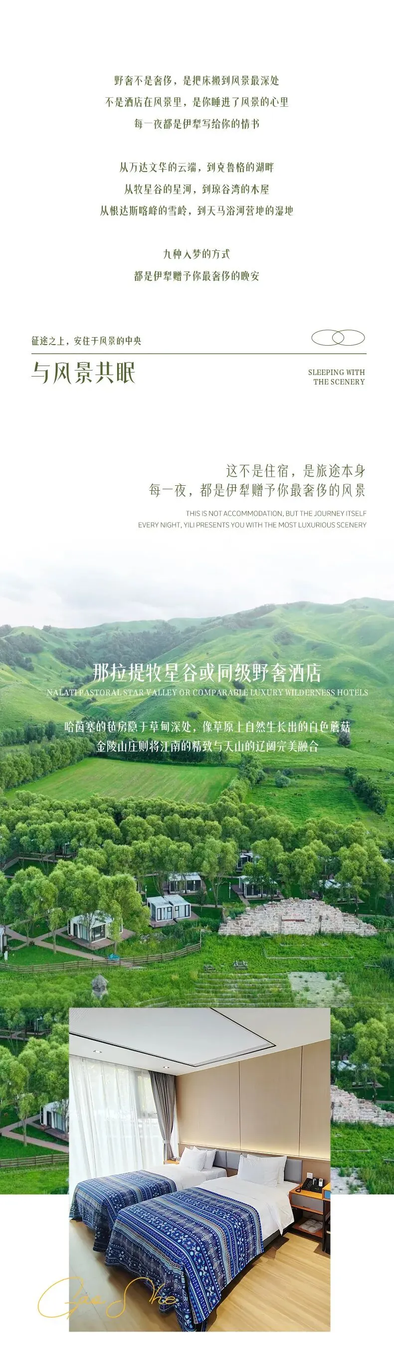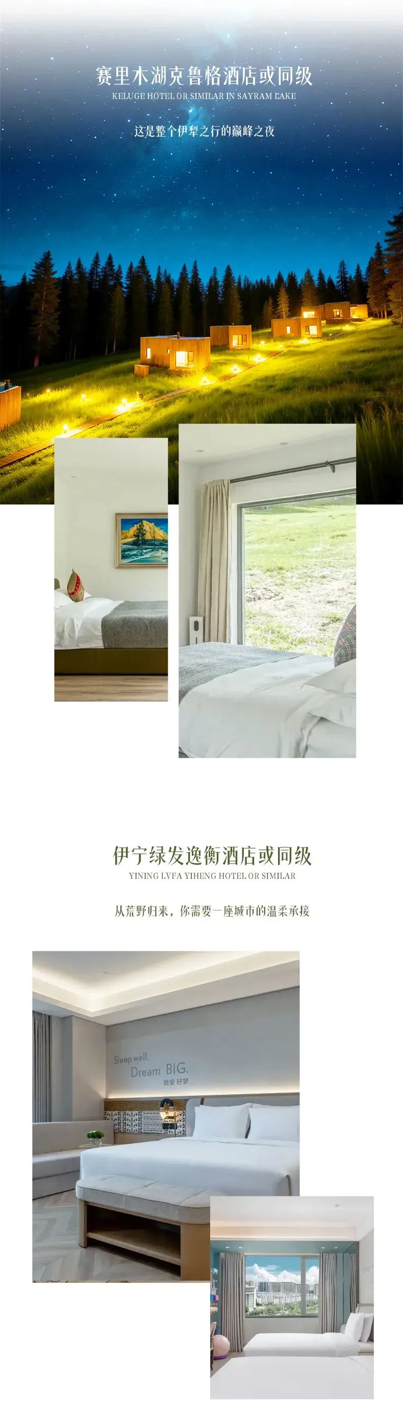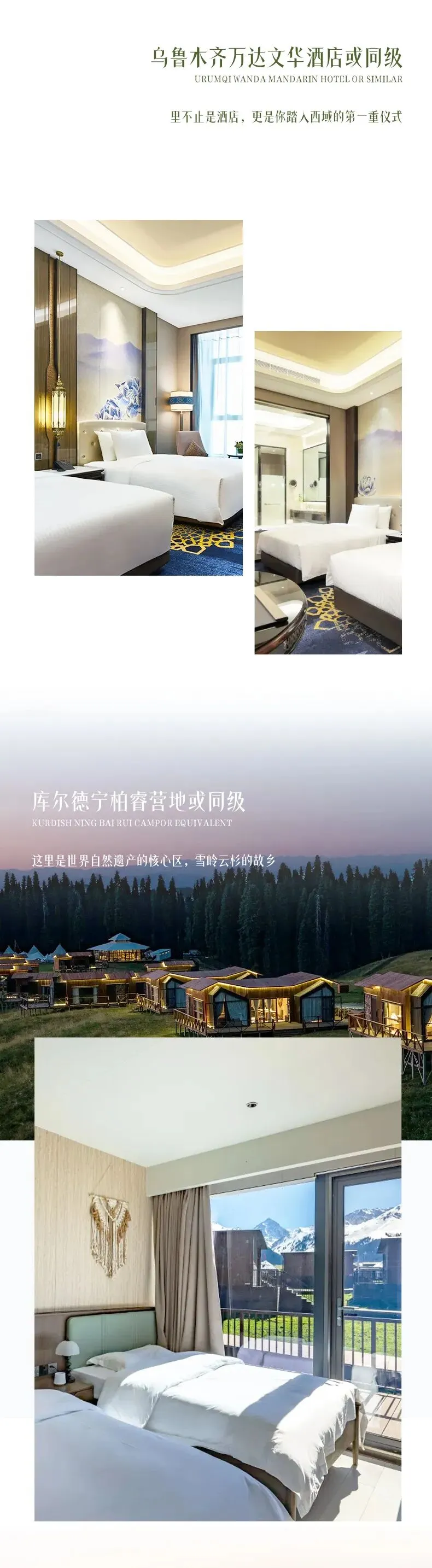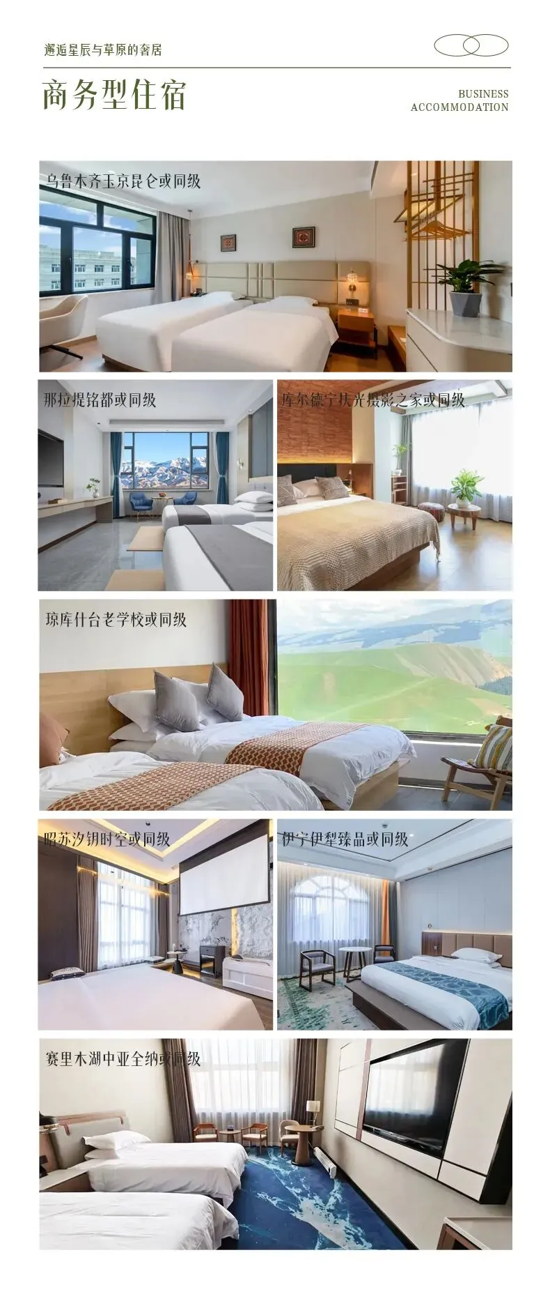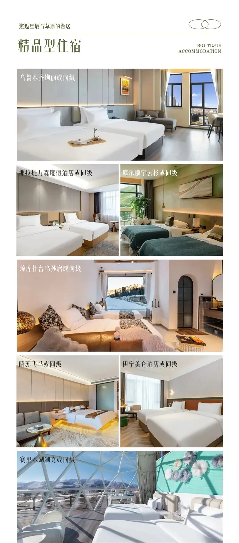 第一晚:乌鲁木齐绚丽/百世昌龙泉或同级 第二晚:那拉提万森度假酒店/澜海御庭/丽呈/那拉提度假酒店/逸仙森/观山酒店/同级 第三晚:那拉提万森度假酒店/澜海御庭/丽呈/那拉提度假酒店/逸仙森/观山酒店/同级 第四晚:库尔德宁云杉/柏琳或同级 第五晚:琼库什台乌孙启/峰海云景空中/林溪古道/叁石民宿/且慢/暮云春树/伊南里塞外美学或同级 第六晚:昭苏飞马/天马/盛疆业大/美豪智选/或同级 第七晚:伊宁美仑酒店/美景或同级 第八晚:赛里木湖潮克/望山一号院 高档+野奢住宿 第一晚:乌鲁木齐万达文华酒店 第二晚:那拉提牧星谷/哈茵塞/金陵山庄或同级 第三晚:那拉提牧星谷/哈茵塞/金陵山庄或同级 第四晚:库尔德宁柏睿营地/溪谷营地或同级 第五晚:琼库什台琼谷湾/宛如故里或同级 第六晚:昭苏湿地公园天马浴河野奢营地/望湖庄园270度落地窗或同级 第七晚:伊宁绿发逸衡酒店/绿发洲际/天缘国际/温州国际/伊犁河宾馆或同级 第八晚:赛里木湖克鲁格酒店 | |