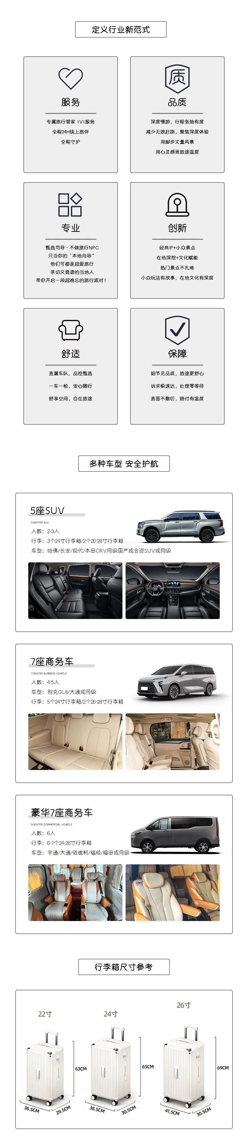 用车 | 根据出行人数选择相对应车型,每人限携带一个24寸以内行李箱,如有行李不符问题请提前咨询 |