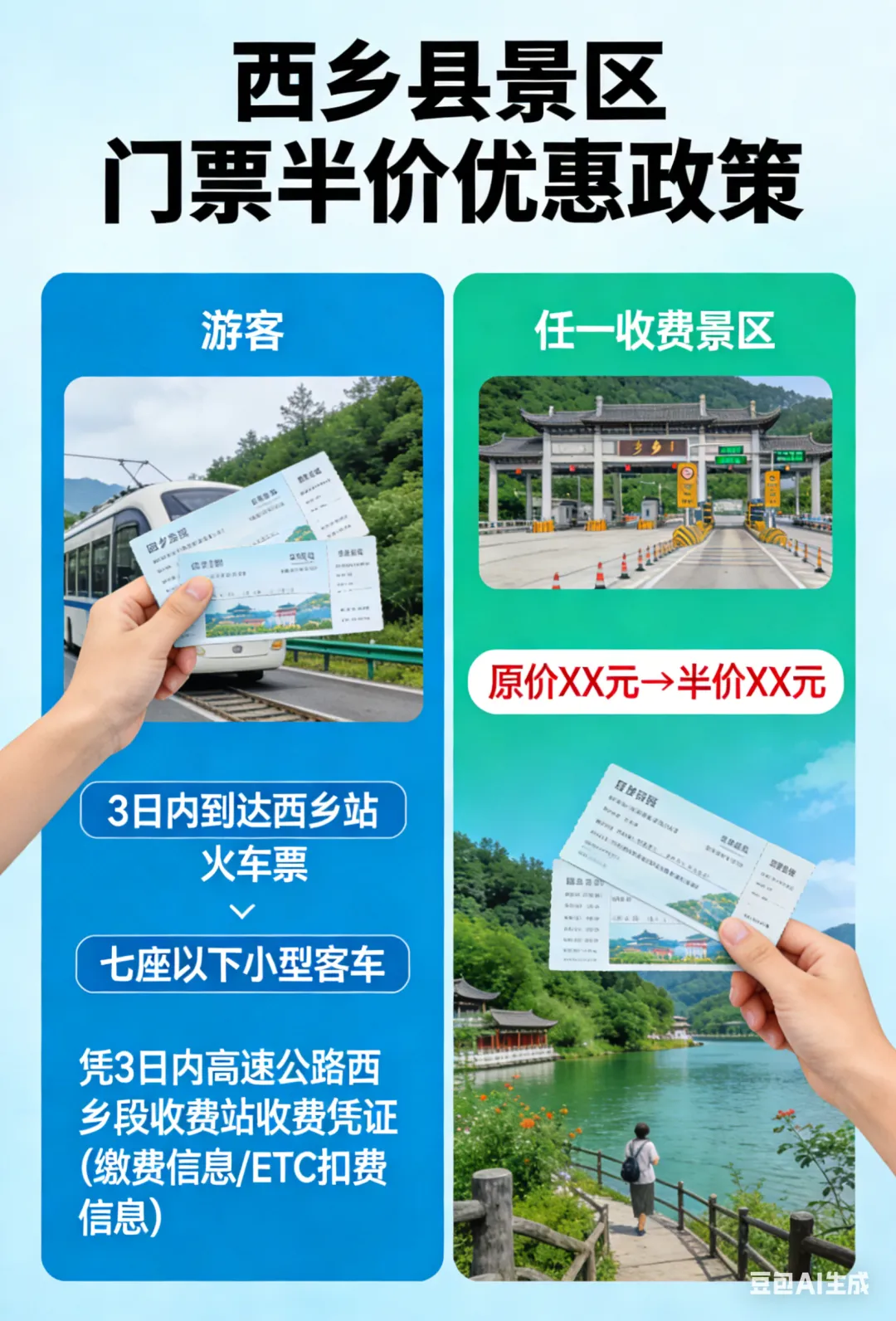 优惠内容:所有游客凭3日内到达西乡站火车票或自驾七座以下小型客车凭3日内高速公路西乡段收费站收费凭证(缴费信息,ETC扣费信息)前往县域内任一收费景区,均可享受门票半价优惠(不含体验项目)。注:(火车票一票一人,高速收费凭证同车人都可享受优惠)