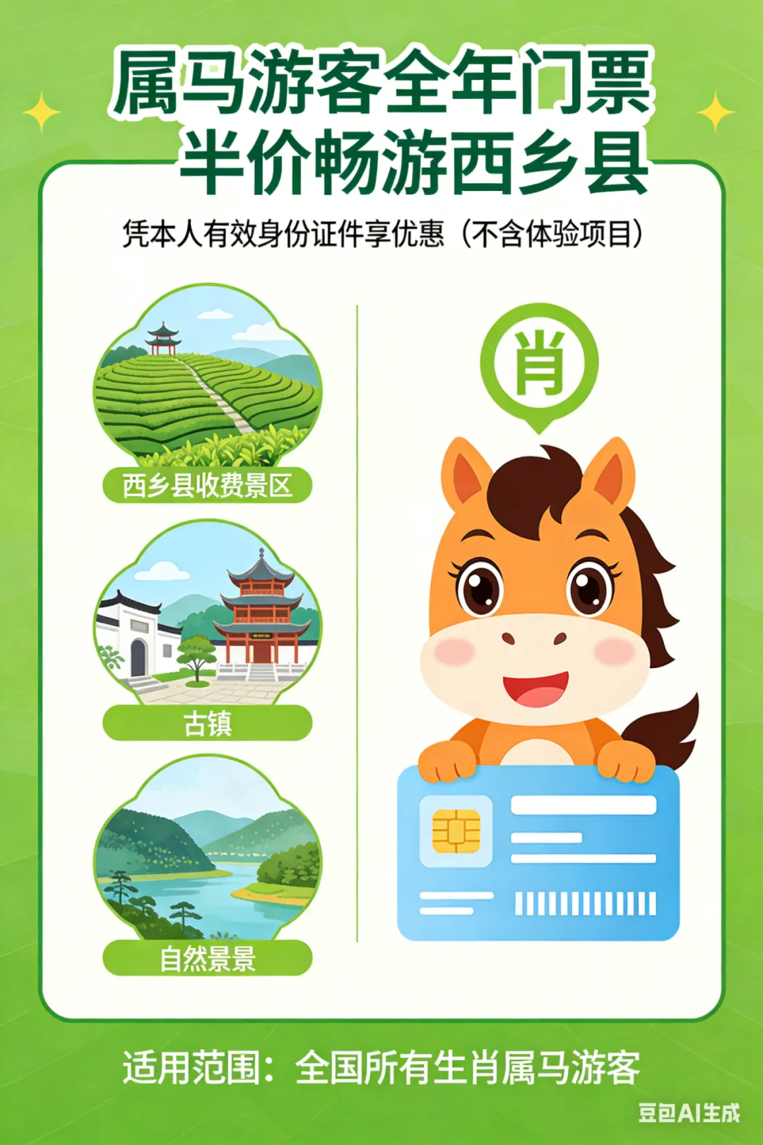 优惠内容:属马游客凭本人有效身份证件,可全年享受门票半价畅游西乡县所有收费景区(不含体验项目)。