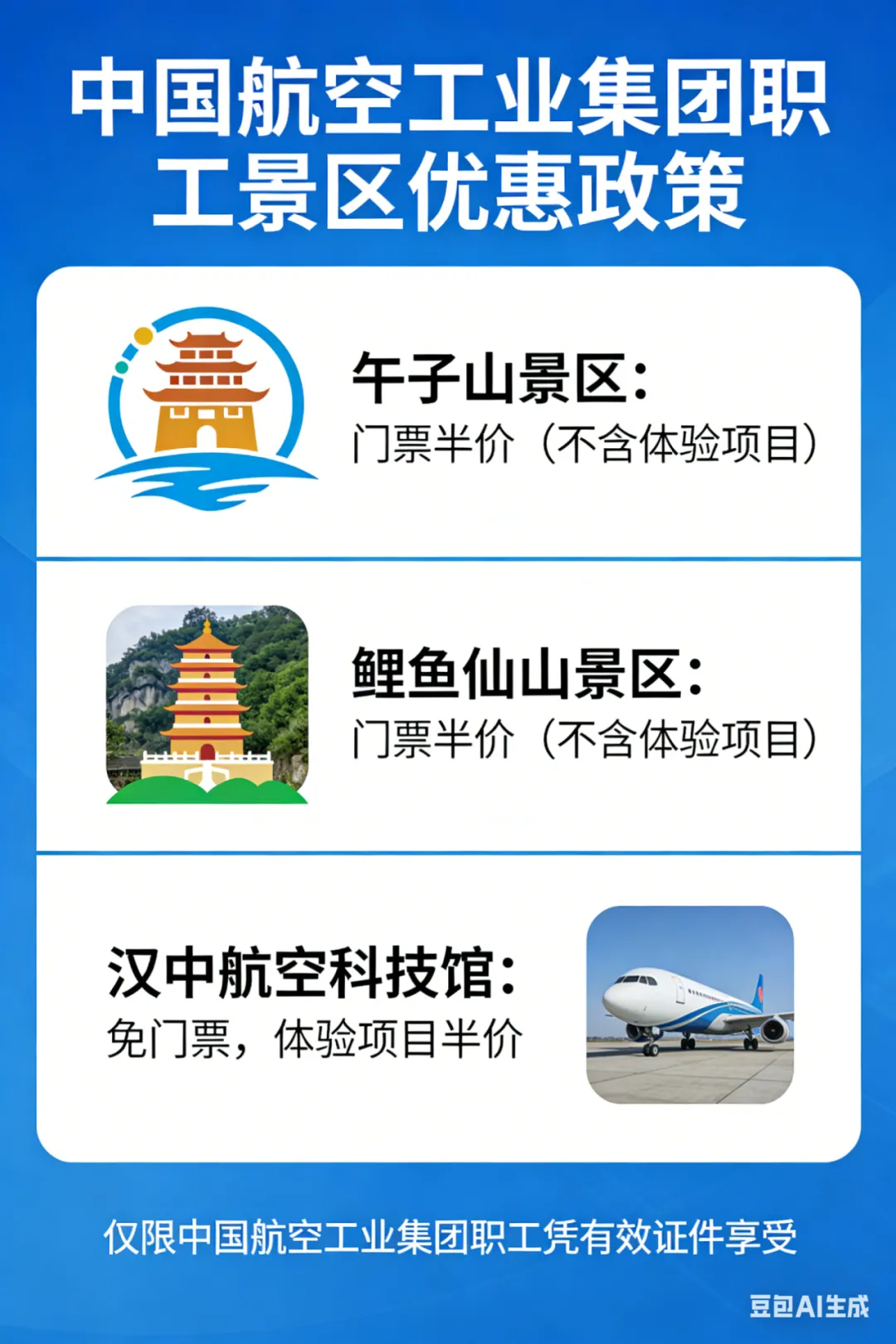 优惠内容:中国航空工业集团职工凭证件享受午子山景区、鲤鱼仙山景区门票半价优惠(不含体验项目),汉中航空科技馆免门票,体验项目半价优惠
