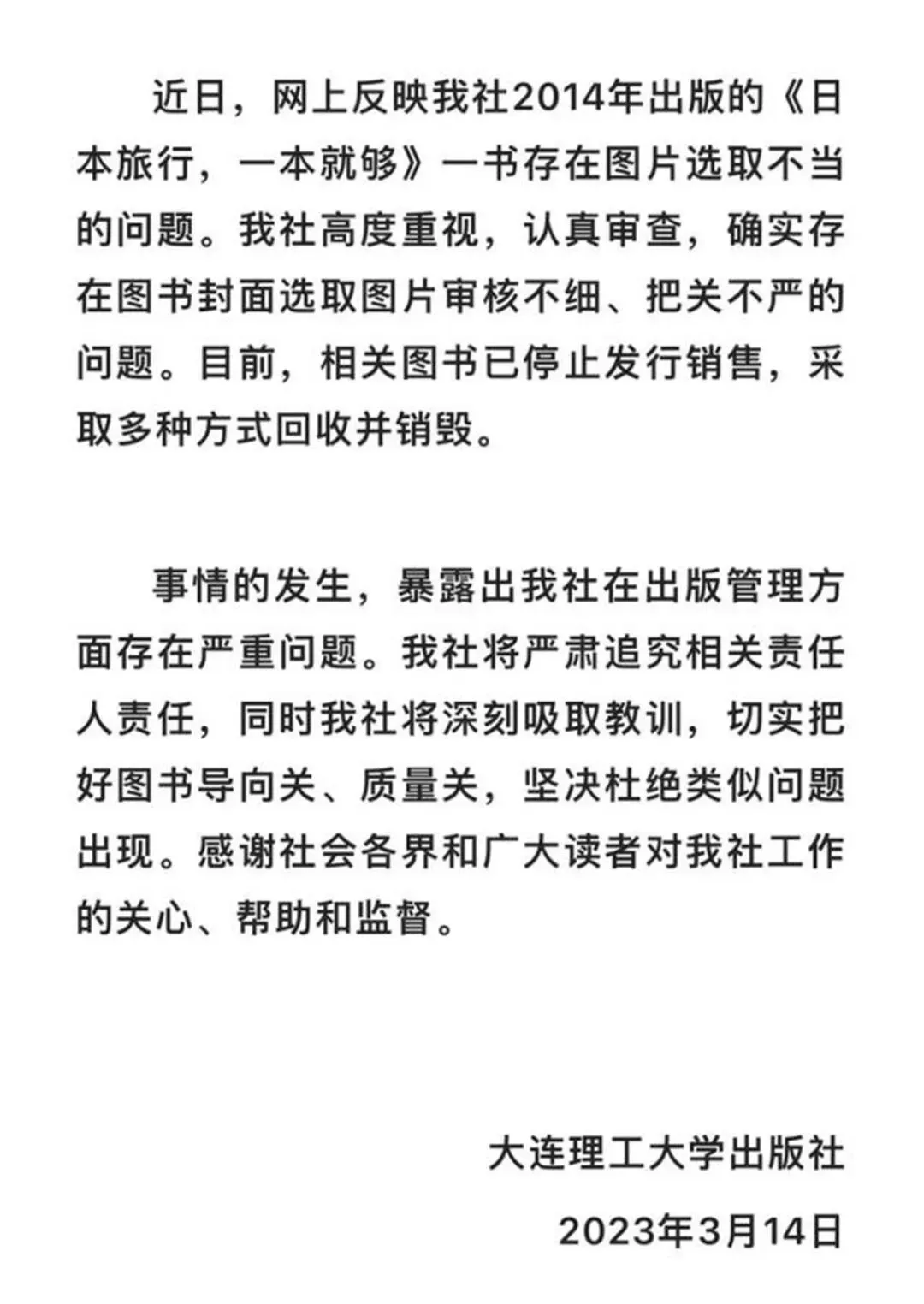 旅游攻略竟拿靖国神社图片当封面!涉事出版社回应:回收销毁极目新闻记者 陈俊 综合潮新闻、澎湃新闻报道,3月12日,有网友发现,大连理工大学出版社出版的一本日本旅游攻略书籍,疑似使用靖国神社当作封面。13日下午,多个网购平台上显示涉事书籍已下架。 视频剪辑 彭婉馨 3月13日中午,该书在多个网购平台上均能被检索到,并显示仍有库存。极目新闻记者查阅书籍封面看到,该书封面右下角印有与靖国神社一致的图片,主编为金利,单价从19.9元到33元不等。此前,有媒体记者致电大连理工大学出版社质量管理办公室,工作人员表示,该书确由其出版,但目前市面上没有在售。至于书籍封面是否使用了靖国神社图片,对方则称并不清楚。随后,大连理工大学出版社一名工作人员回应,此事须向领导请示后才能予以回答。