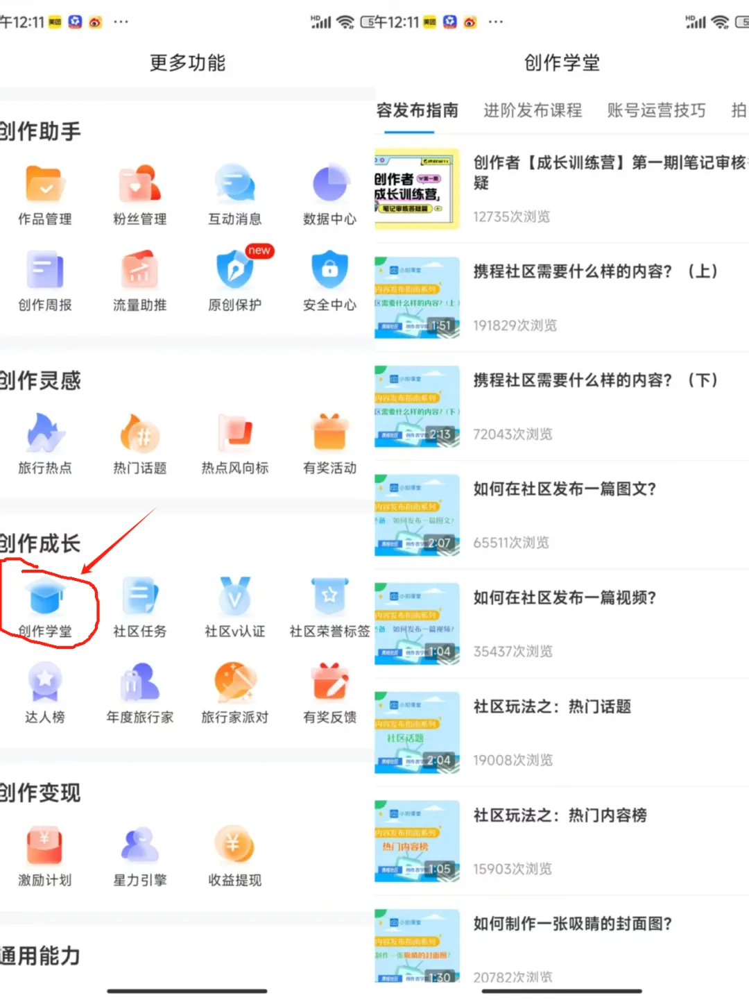 - 笔记的浏览量越大,互动性高对应的收入就会越高,目前平台给出的浏览单价是0.02/次(用户停留时间超过5秒才算有效浏览) (ps:这个是之前的,现在是单篇笔记100/篇封顶,单账户收益1500/月封顶) - 发布三篇笔记后,才可以参加“创作激励计划” 另外就是携程官方里有详细的视频教程,感兴趣的朋友可以去看下 “创作者中心”-“更多功能”-“创作学堂”点进去就可以看到