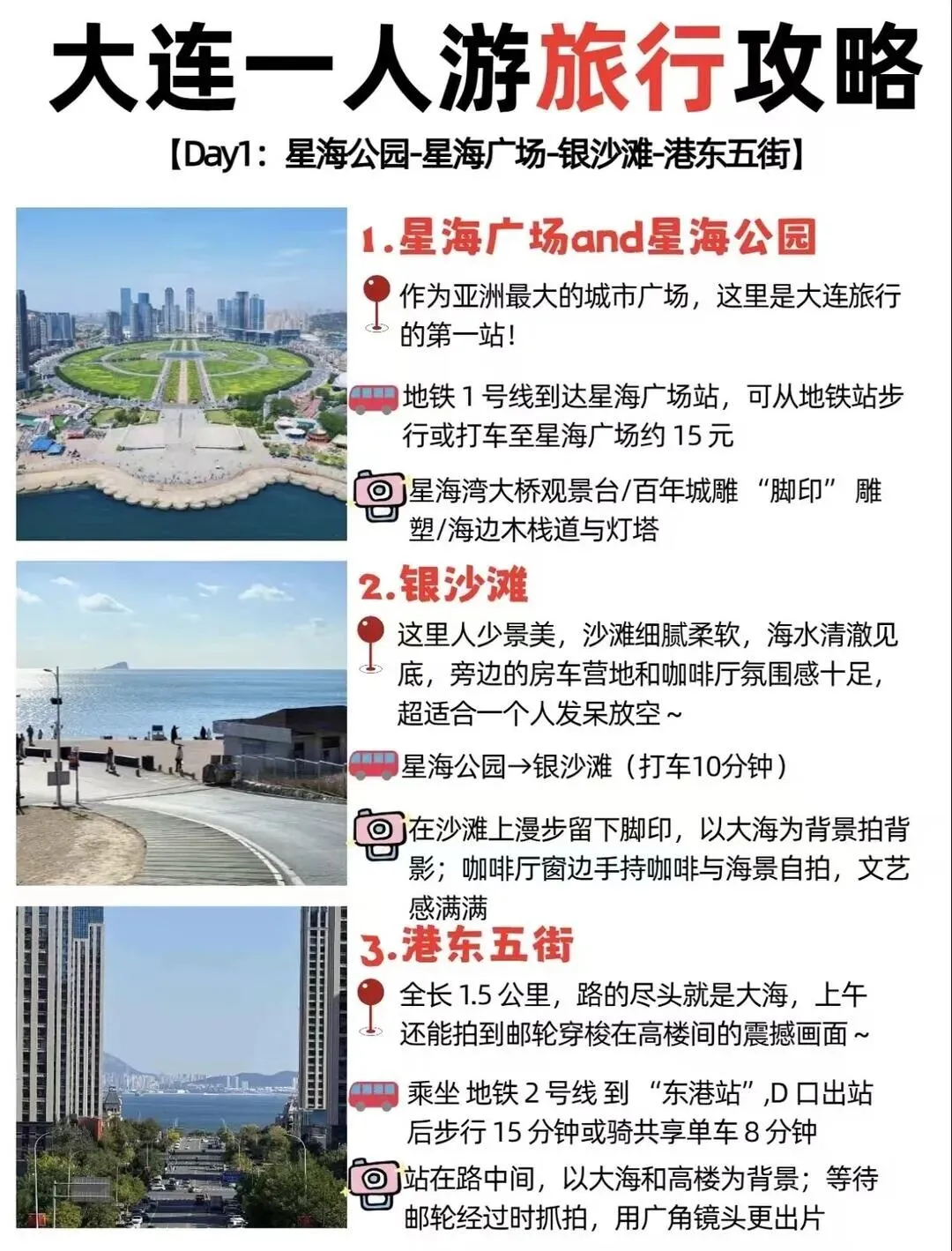 D.1:.星海广场 → 贝壳博物.馆 .→ 大.连森林动物园 → 滨.海路徒步一段