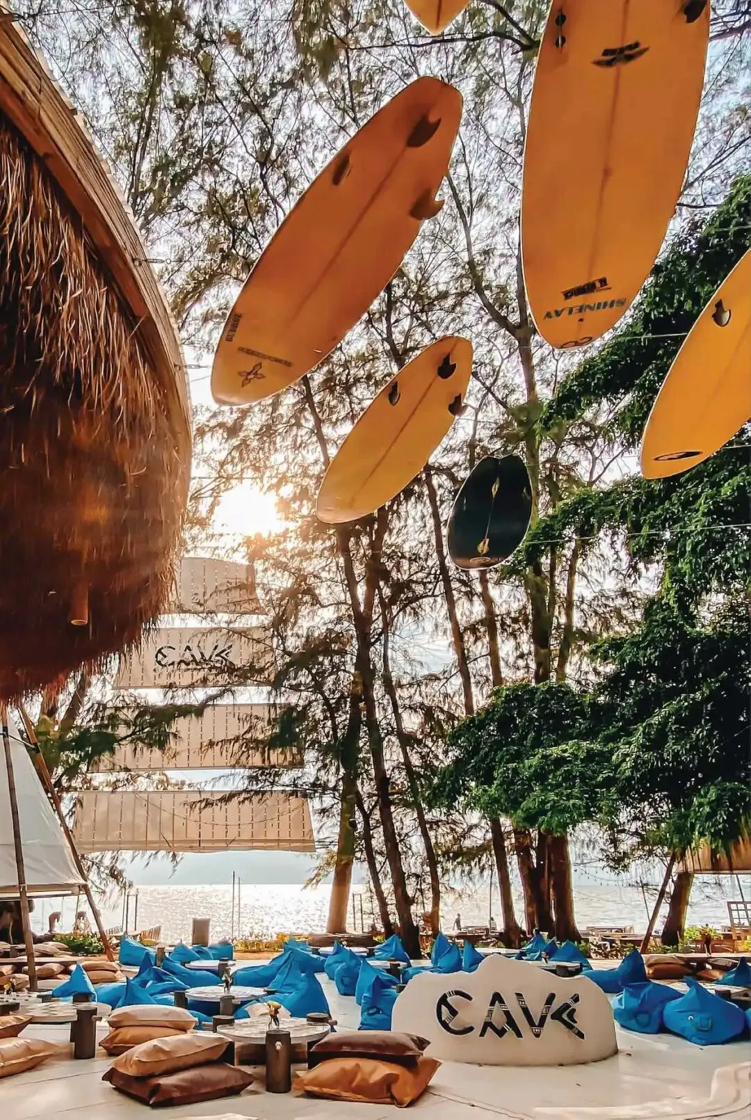 这是一家结合咖啡吧,酒吧,餐厅为一体的综合Club。夏日海岛风格设计,满满的夏日风情。茅草屋、帐篷、帆船、冲浪板、懒人沙发……各种拍照好看的元素在餐厅里随处可见。
