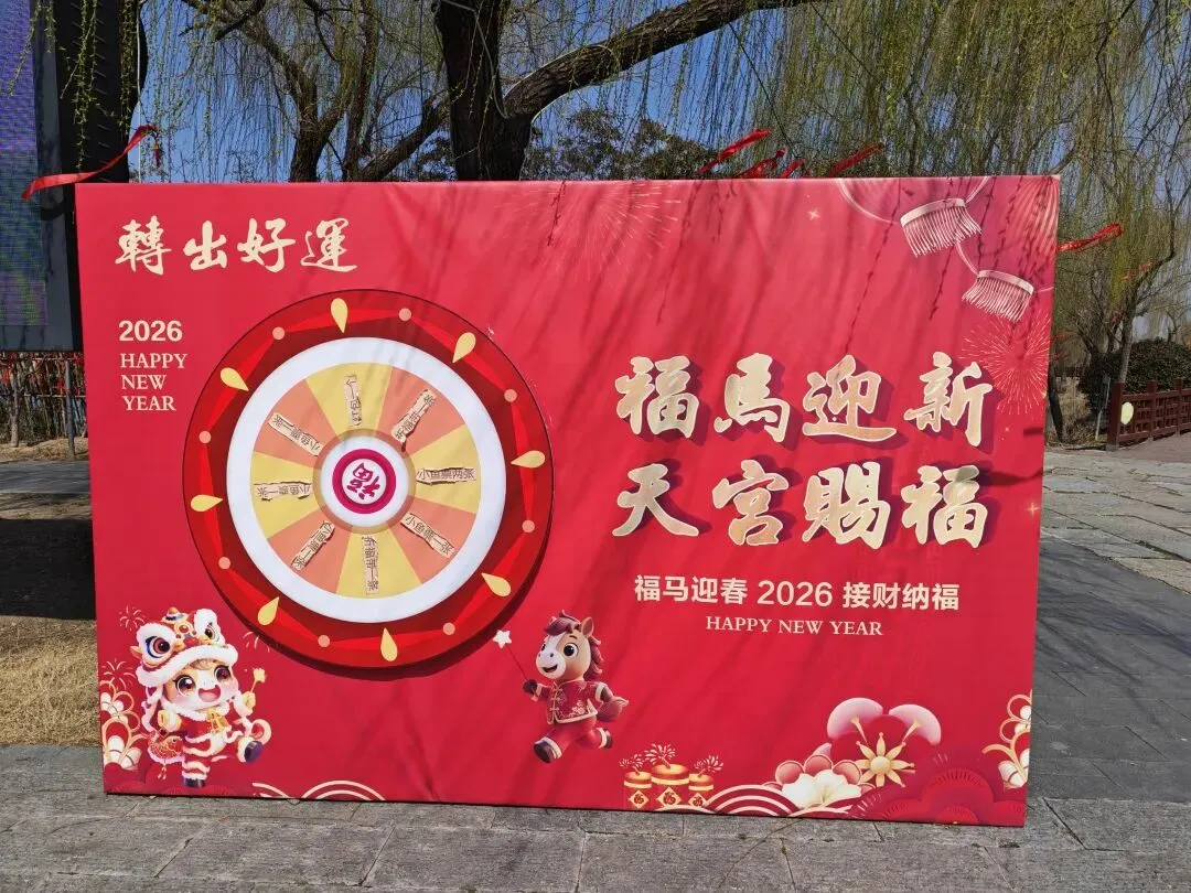 正月的马踏湖过年的氛围满满的,进入景区,排排灯笼高高挂起,转出好运,福马迎新、天宫赐福,招示游人赶紧拍照打卡留念……
