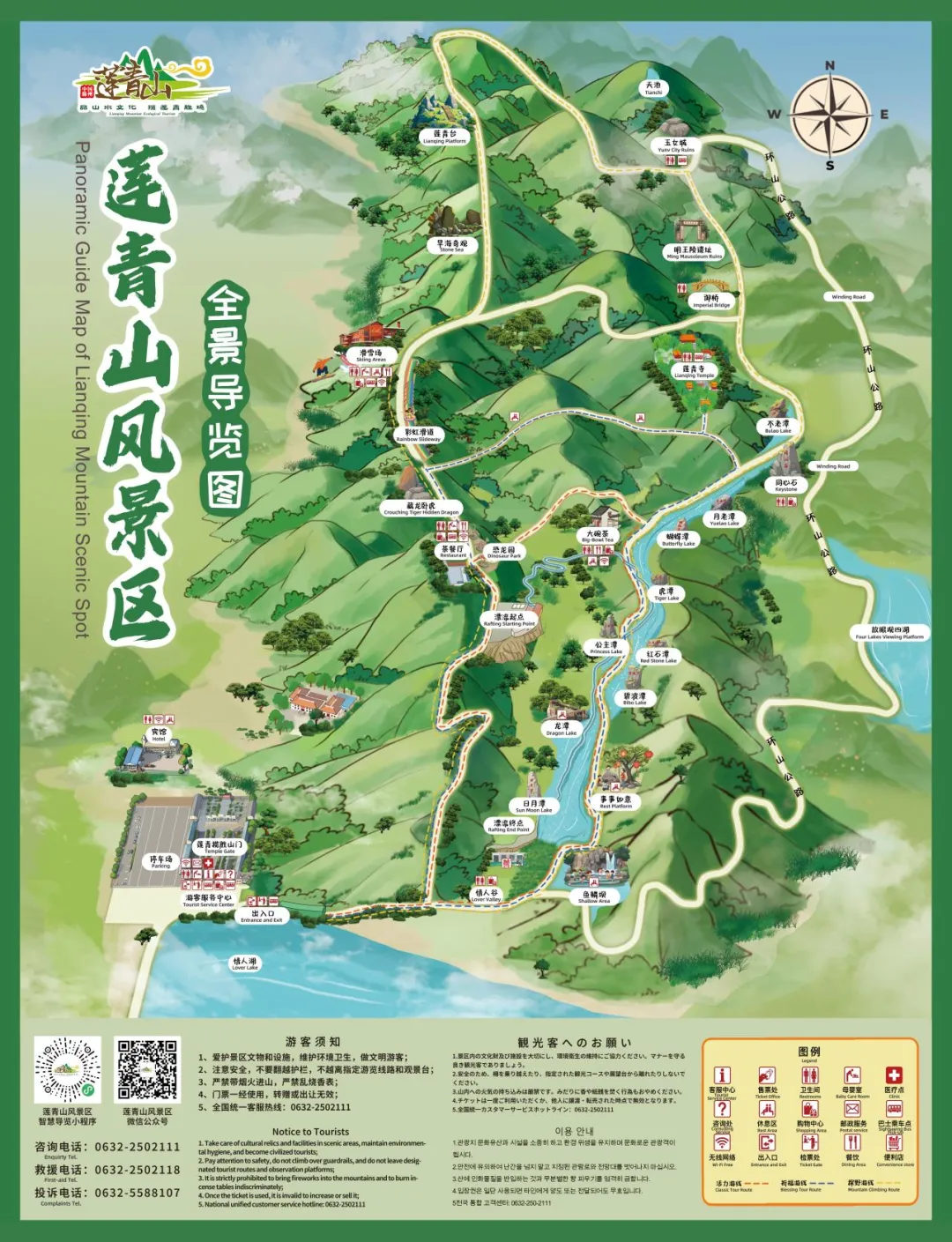 推荐路线:石牌坊登山步道→抱抱莲青福打卡点→莲青揽胜平台广场→莲青头条拍报机→茶餐厅→明王陵→彩虹滑道→敲响莲青好运锣打卡点→景区出口